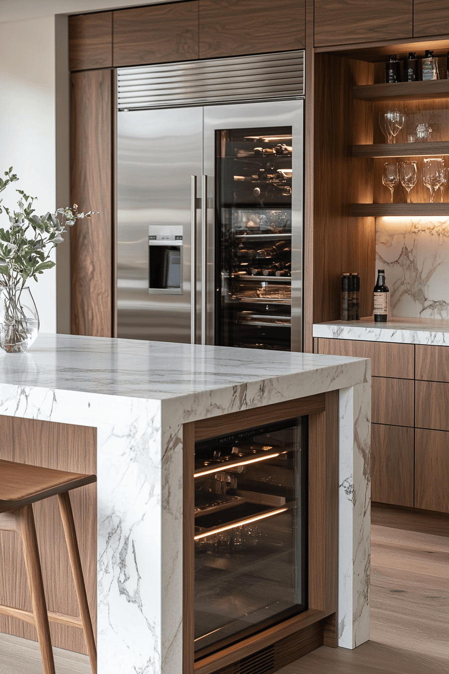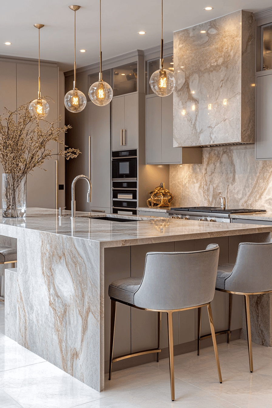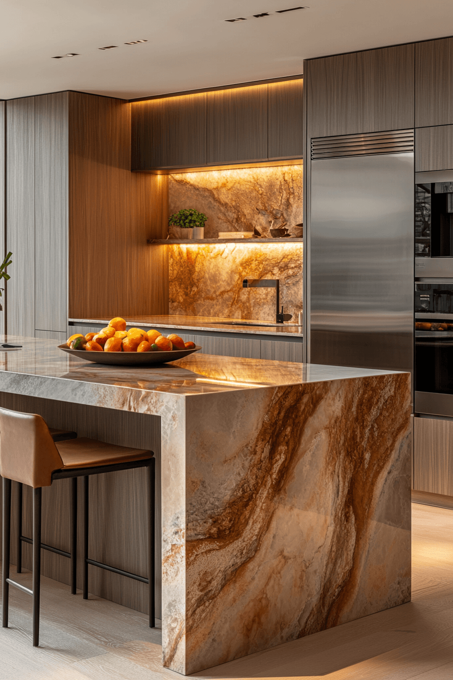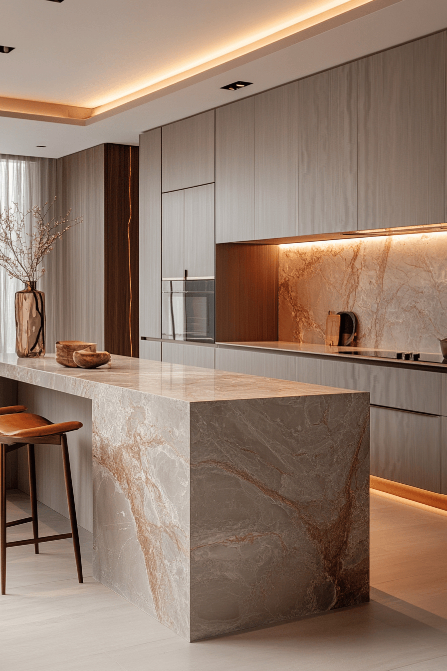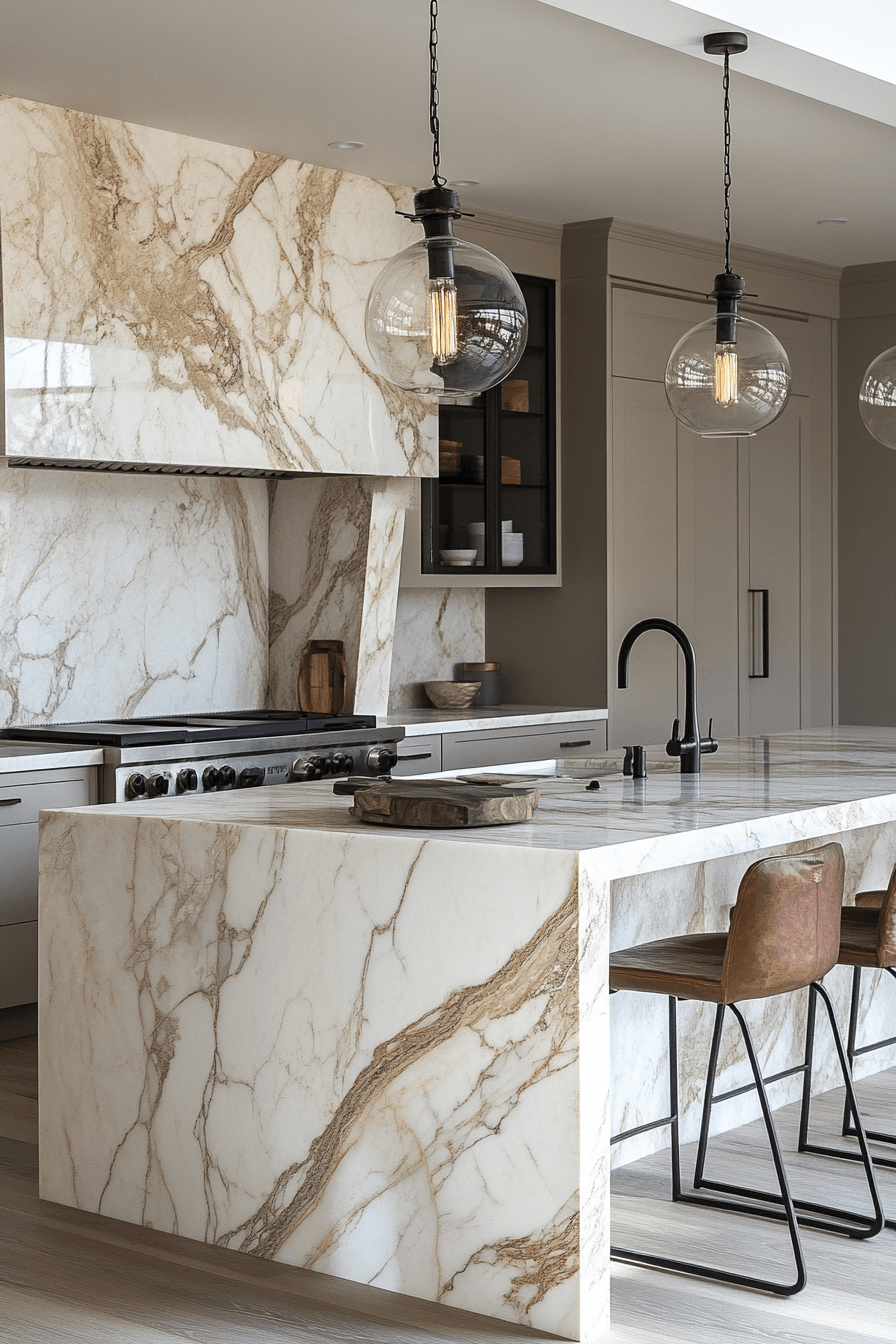 Bold marble is taking kitchens to the next level in 2026 kitchen trends with its dramatic veining and natural beauty. Large slabs across islands and backsplashes instantly become the focal point of the room. When paired with simple cabinetry, the marble truly gets to shine. Soft lighting enhances every detail, making the patterns feel even more dynamic. It’s a stunning way to add both elegance and personality. Transform your kitchen with statement marble that turns heads.