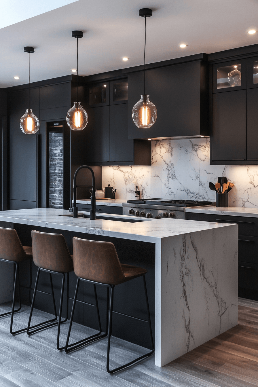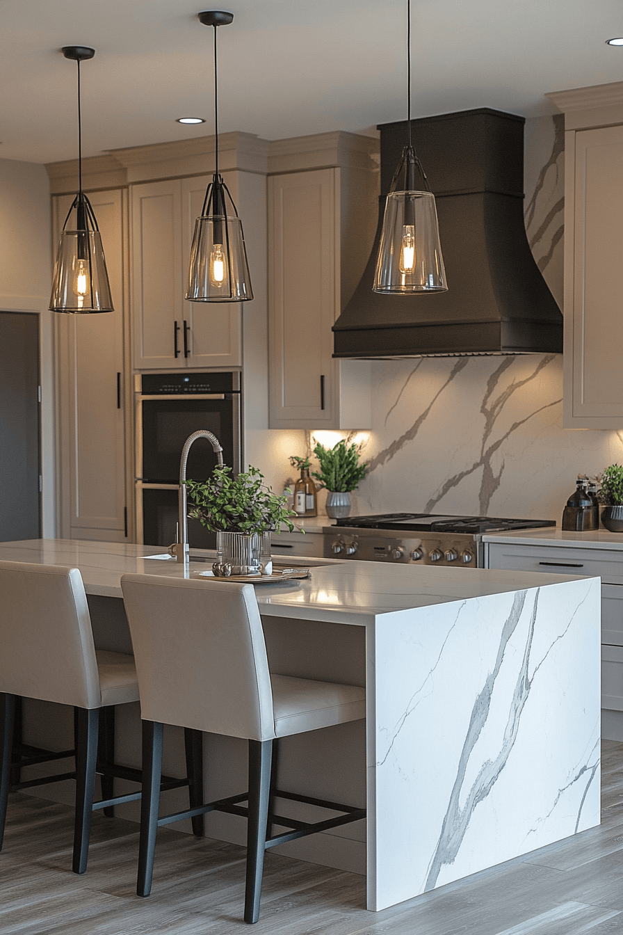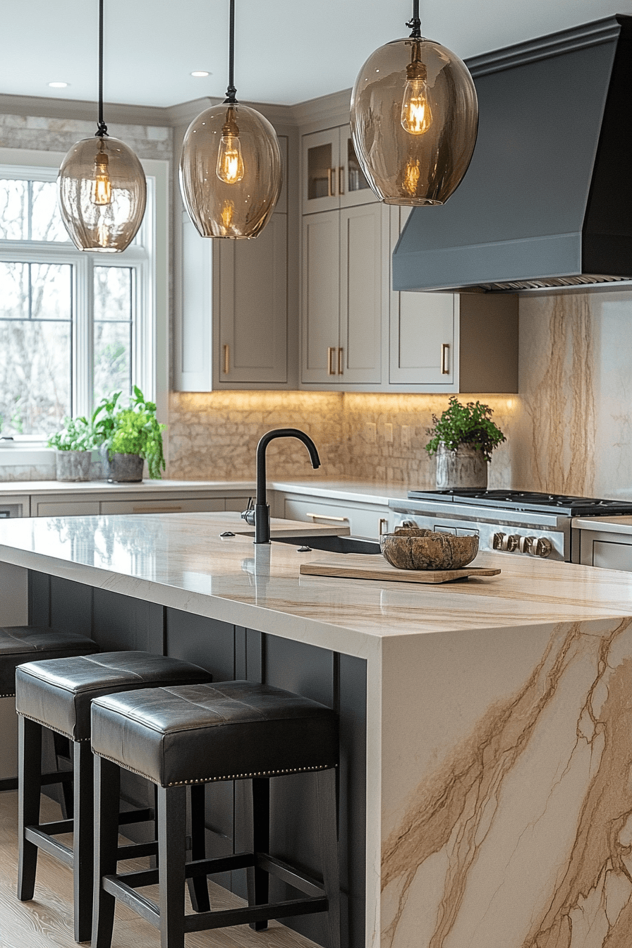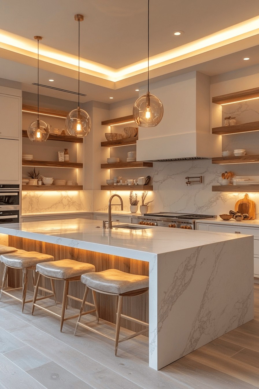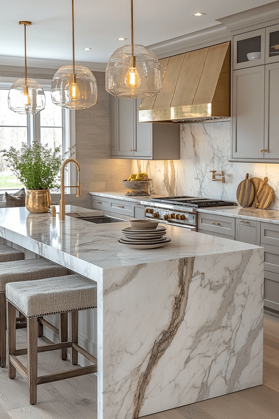 Bold marble is taking kitchens to the next level in 2026 kitchen trends with its dramatic veining and natural beauty. Large slabs across islands and backsplashes instantly become the focal point of the room. When paired with simple cabinetry, the marble truly gets to shine. Soft lighting enhances every detail, making the patterns feel even more dynamic. It’s a stunning way to add both elegance and personality. Transform your kitchen with statement marble that turns heads.