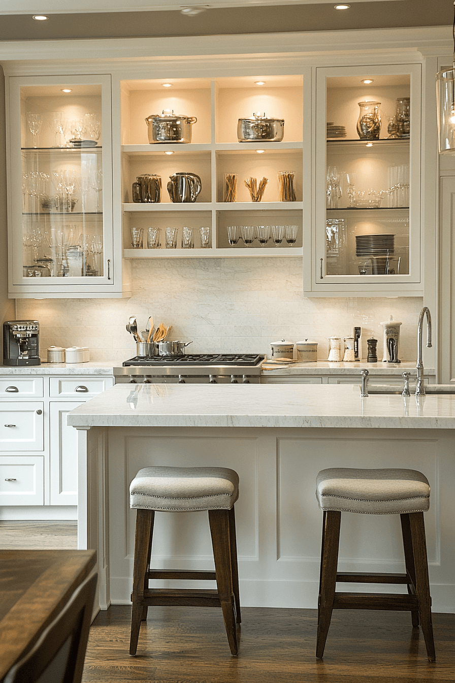 Glass-front cabinets are adding lightness and style to 2026 kitchen trends by blending storage with display. Clear or textured glass allows your favorite dishware to become part of the design. Interior lighting highlights each piece while keeping everything organized. This approach softens heavier cabinetry and makes the kitchen feel more open. It’s the perfect mix of function and visual appeal. See how glass-front details can instantly brighten your space.