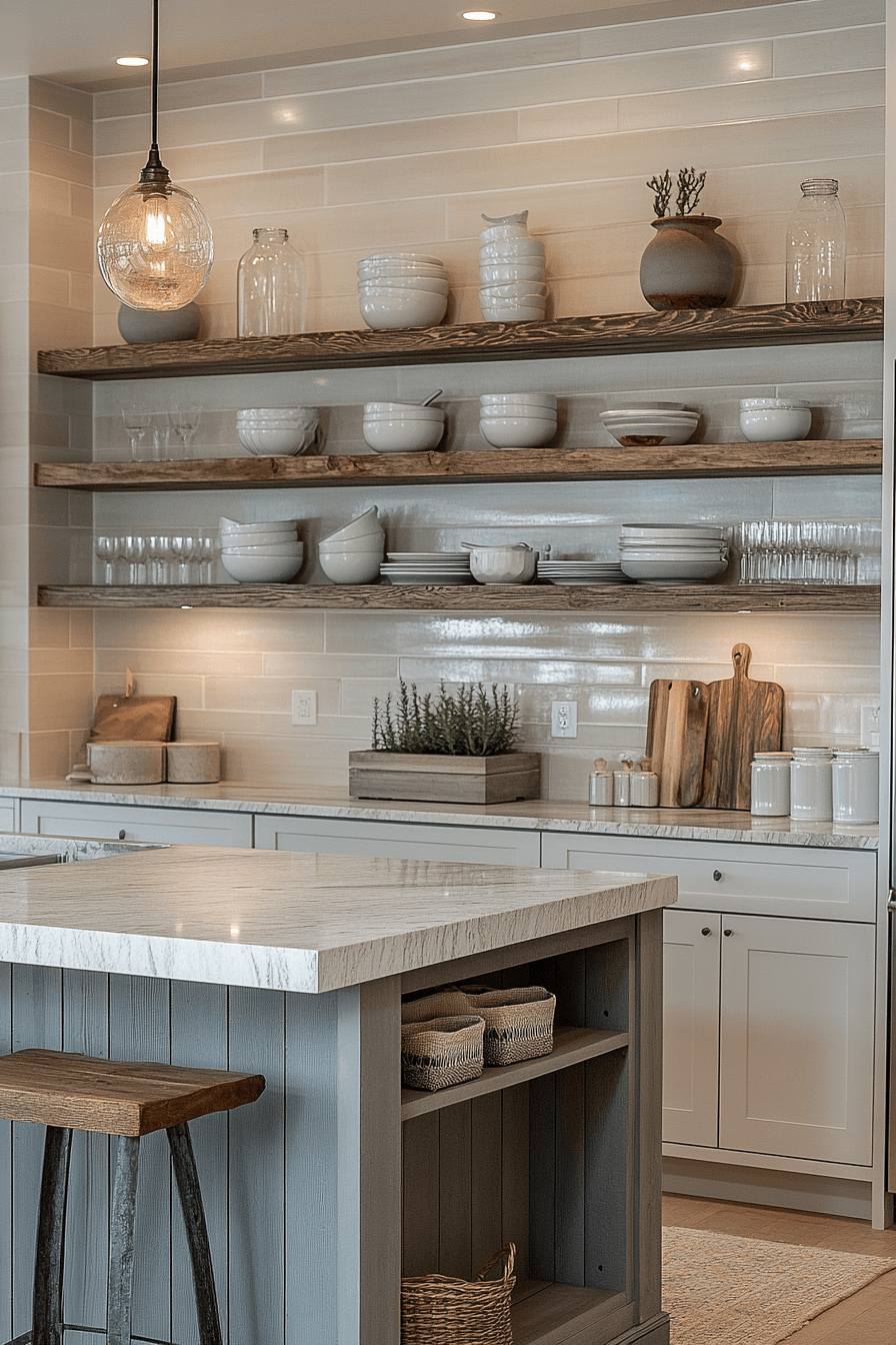 Open shelving is getting a refined makeover in 2026 kitchen trends with a focus on clean, curated styling. Instead of overcrowding, shelves are thoughtfully arranged with balanced layouts and cohesive colors. Natural materials like wood or stone paired with soft lighting elevate the look. This creates breathing room while still offering practical storage. The overall effect feels intentional, airy, and beautifully styled. Learn how to style open shelves with a polished, modern touch.