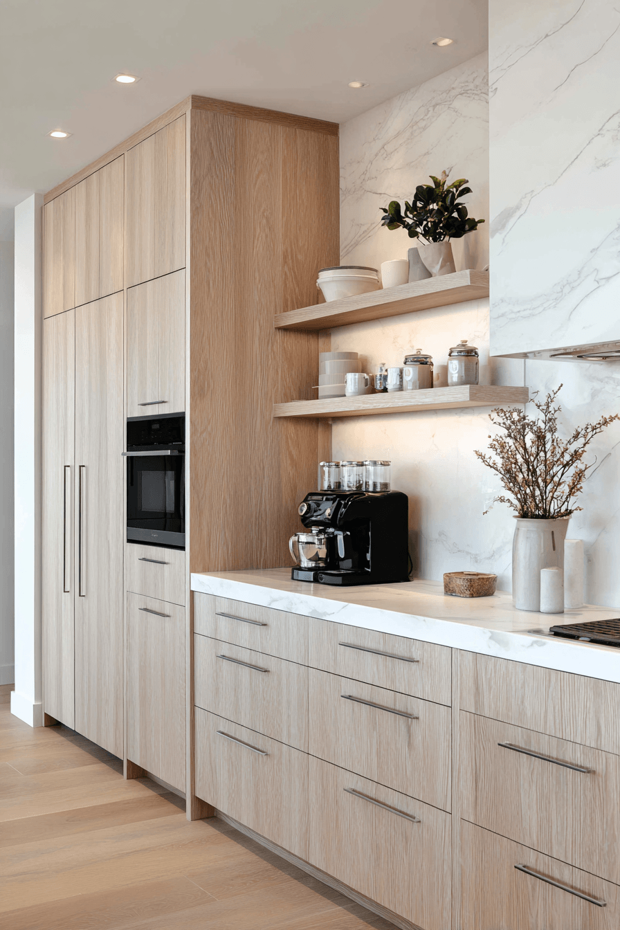Blending Scandinavian simplicity with Japanese calm creates a peaceful, balanced space that shines in 2026 kitchen trends. Light wood tones, clean lines, and muted colors set the foundation for a serene environment. Natural materials and uncluttered surfaces keep everything feeling intentional and functional. Subtle textures and warm lighting add just enough softness to the minimalist look. The result is a kitchen that feels calm, grounded, and beautifully timeless. Bring this Japandi-inspired harmony into your kitchen and feel the difference.
