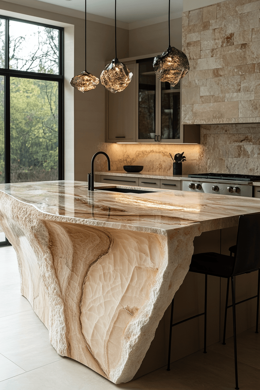 Bold stone surfaces are taking center stage in 2026 kitchen trends, turning kitchens into true statement spaces. Large slabs of marble, quartzite, or travertine flow seamlessly across countertops and backsplashes. The natural veining adds movement and artistry that instantly catches the eye. Paired with simple cabinetry, the stone becomes the hero without feeling overwhelming. It’s a perfect mix of durability and high-impact design. See how dramatic stone can completely transform your kitchen aesthetic.