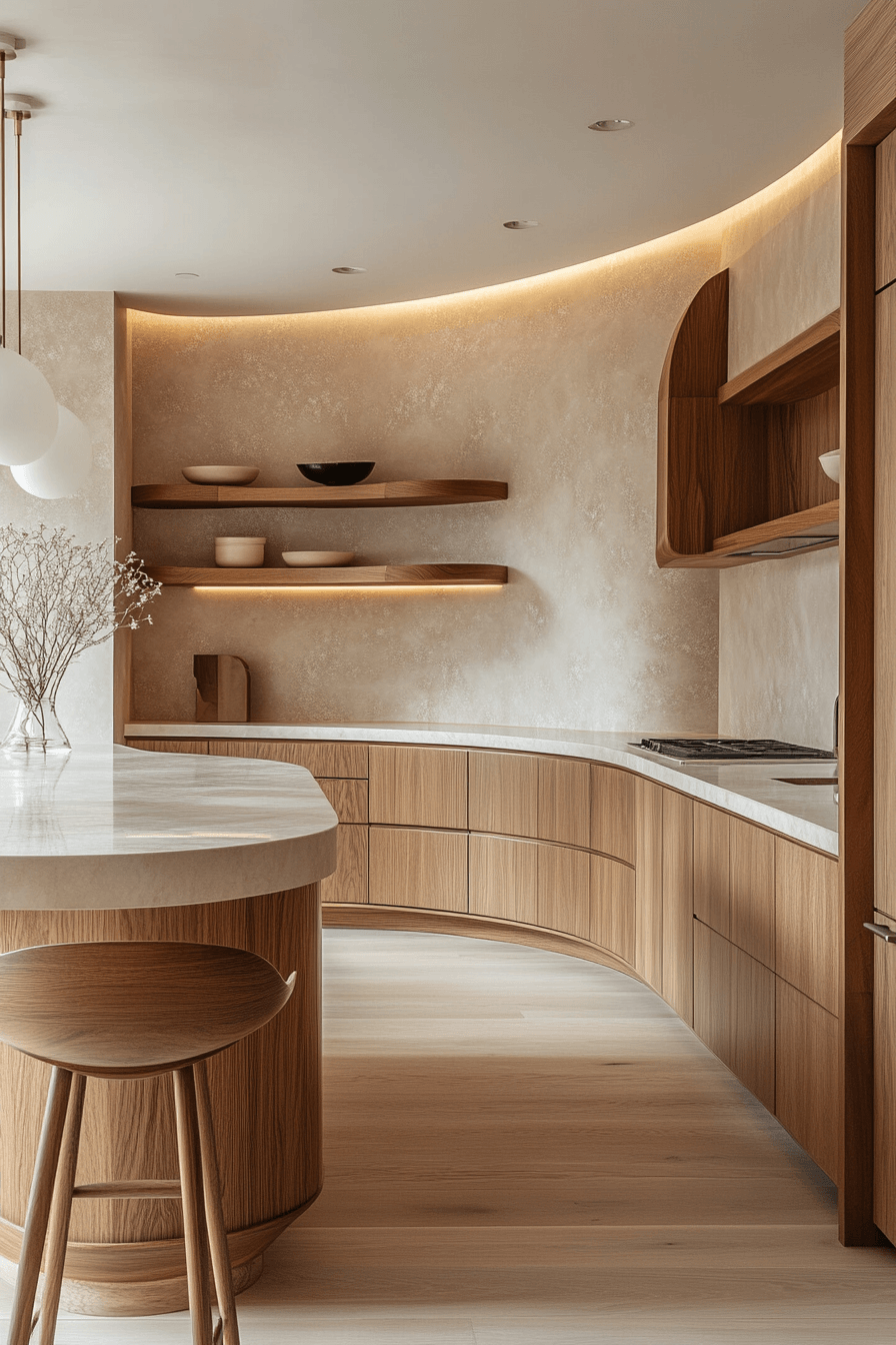 Soft curves are making kitchens feel more welcoming and balanced within 2026 kitchen trends. Rounded islands, curved cabinetry edges, and subtle arches introduce a gentle flow to the design. These shapes help break up rigid lines and create a more relaxed atmosphere. Paired with warm lighting and neutral tones, the space feels both modern and inviting. It’s a beautiful blend of structure and softness. Try incorporating curved details to give your kitchen a fresh new feel.