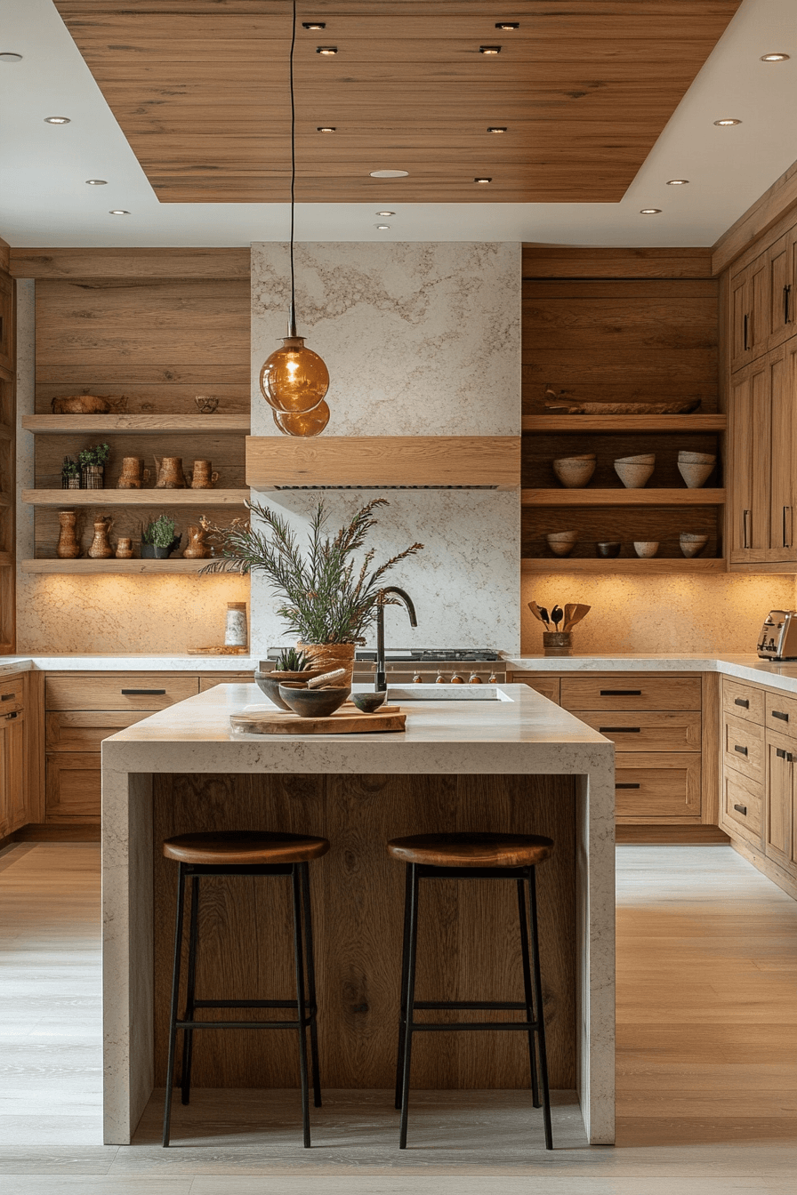Blending nature with clean, modern lines creates a kitchen that feels both fresh and grounded, making it a standout in 2026 kitchen trends. Wood cabinetry, stone surfaces, and matte finishes work together to create a perfect balance of raw and refined. The streamlined shapes keep everything looking current, while natural textures add that cozy, lived-in feel. Soft neutral tones tie it all together for a calming, inviting vibe. It’s the kind of space that feels elevated but still totally livable every day. Tap to create your own organic modern kitchen escape.