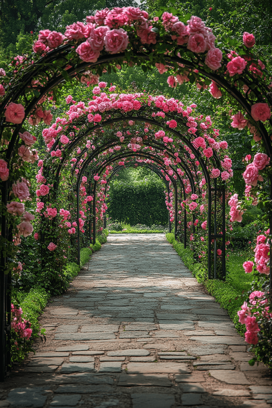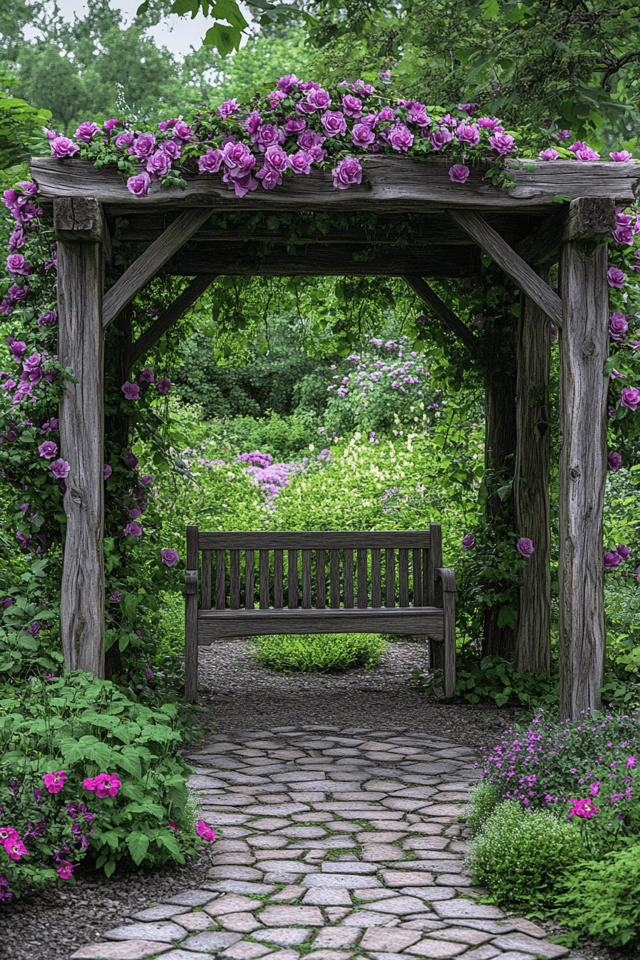 Frame your garden path with rustic elegance using antique yard decor ideas like weathered wooden arbors. These archways invite you into the landscape while adding natural structure. Let climbing roses, wisteria, or clematis weave through the beams for added charm. A vintage bench placed underneath creates a cozy resting spot. The aged wood texture gives off a storybook vibe.