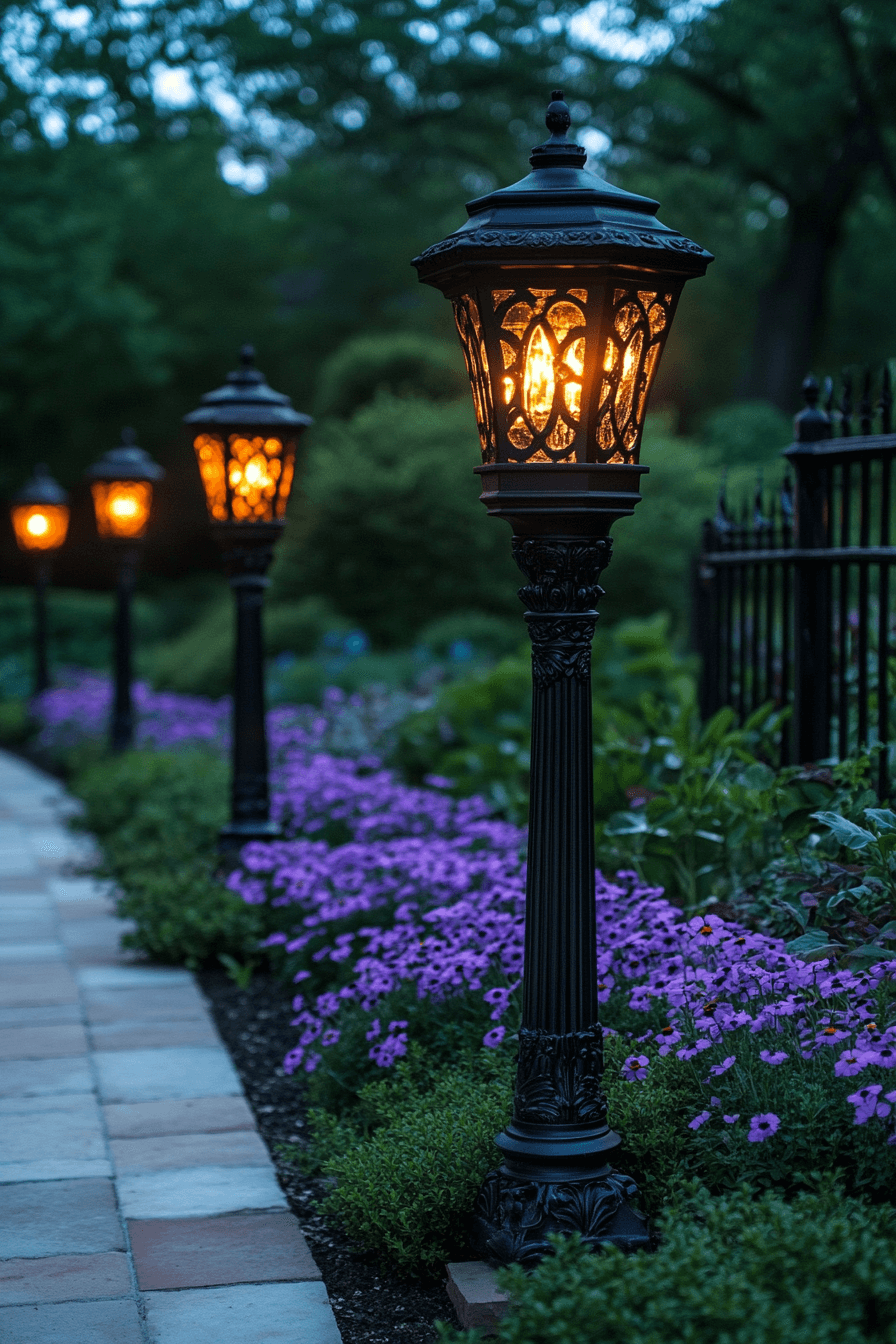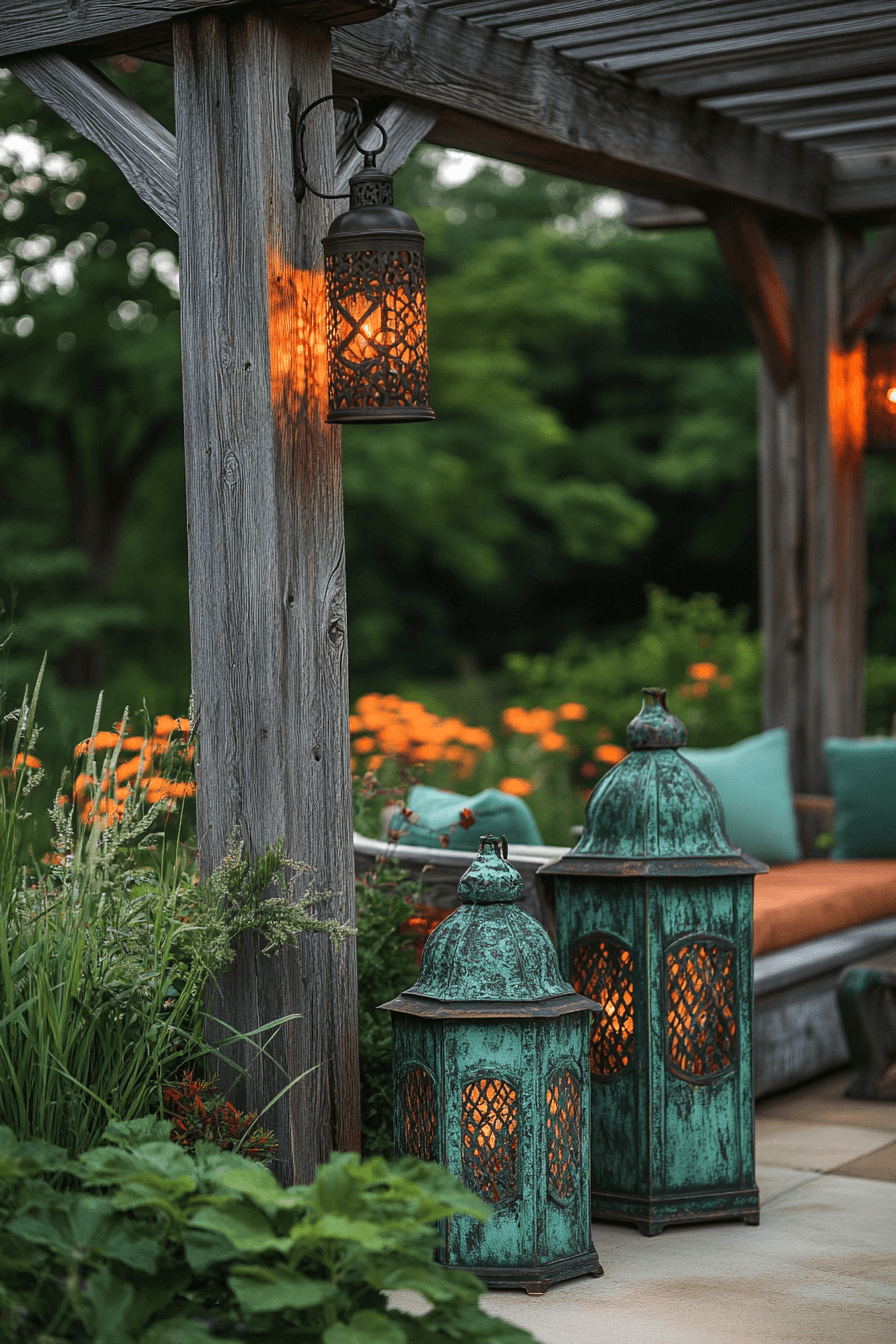 Add an enchanting nighttime glow with antique yard decor ideas focused on vintage outdoor lighting. Lantern-style fixtures with ornate ironwork cast a soft, warm light that feels romantic and welcoming. Line pathways, highlight flower beds, or illuminate a bistro table for extra magic. These lights enhance safety while adding a sense of old-world luxury. Every evening gathering becomes cozier under their glow.