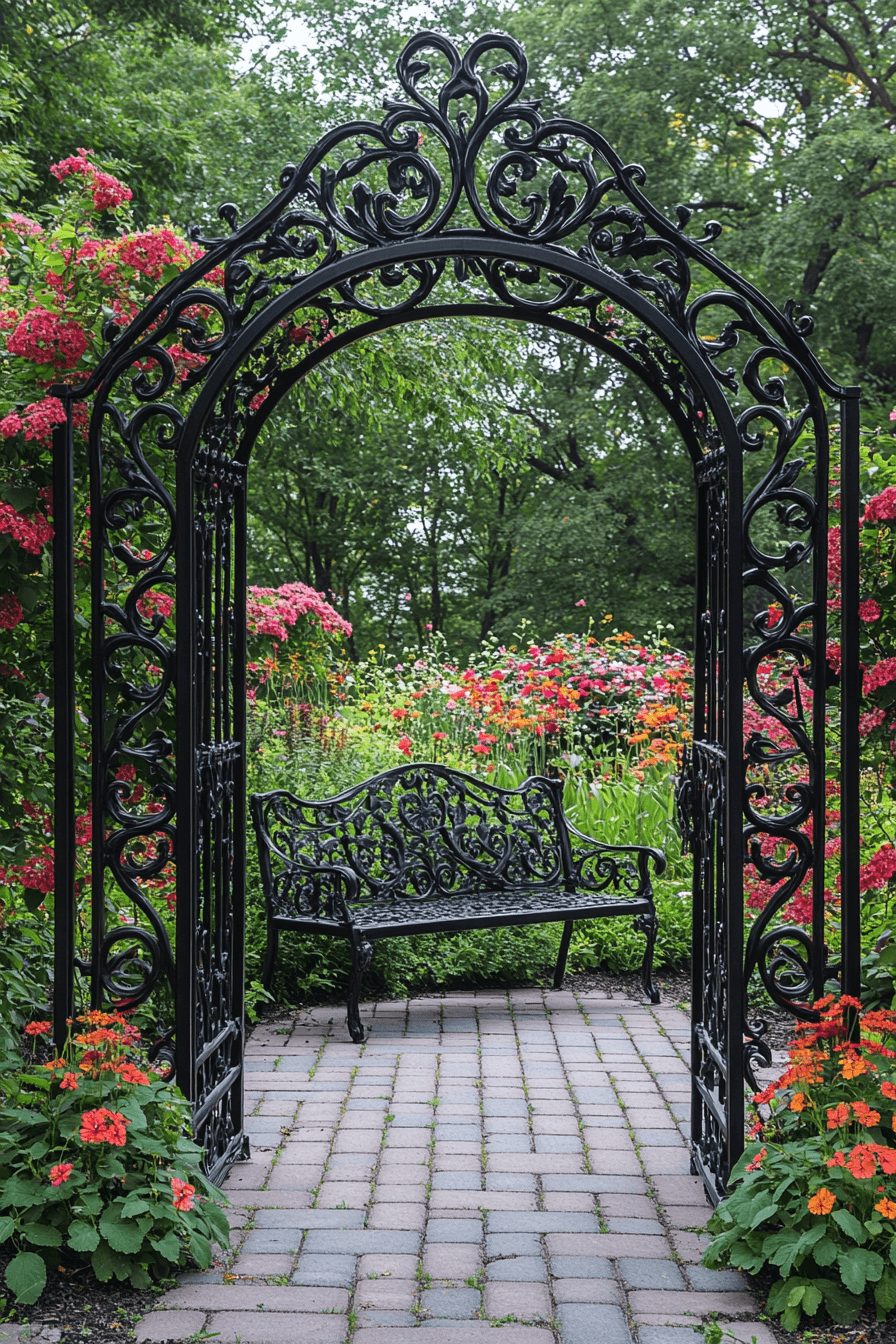 Add historical elegance with antique yard decor ideas focused on wrought iron features. Think vintage gates, decorative trellises, and curved iron benches that add romantic flair. When entwined with greenery or blooms, these pieces take on a fairytale quality. Even a simple iron archway can transform your space. The result is balanced and beautiful, with structure and softness working together.