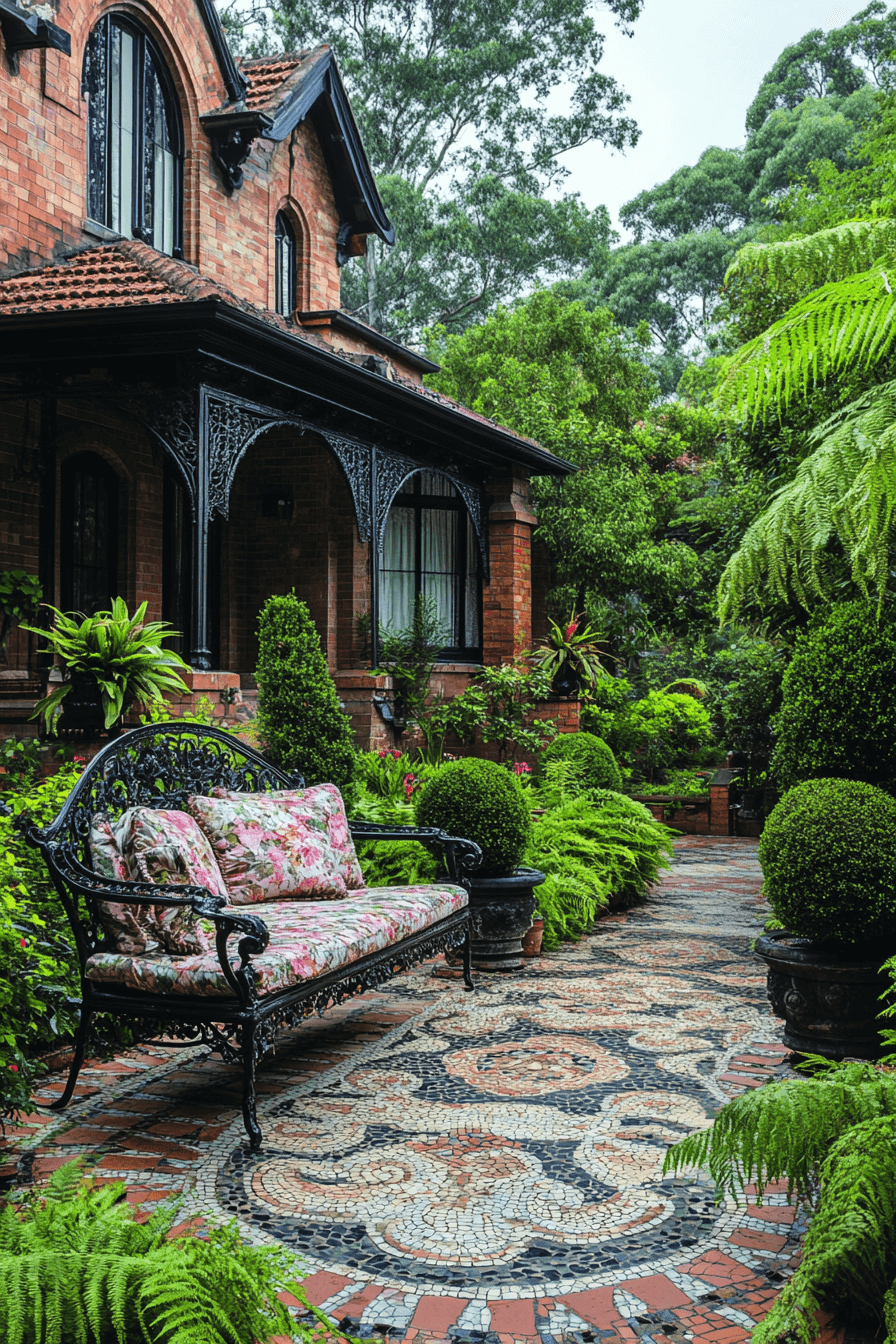 Layer your patio with lush textures using antique yard decor ideas rooted in Edwardian terrace style. Add potted palms and ferns for a soft, green flourish. Pair floral cushions with wicker seating for timeless comfort. Mosaic tabletops offer a touch of artistry and flair. The space feels cozy, elegant, and full of quiet luxury.