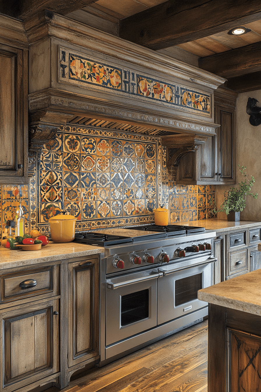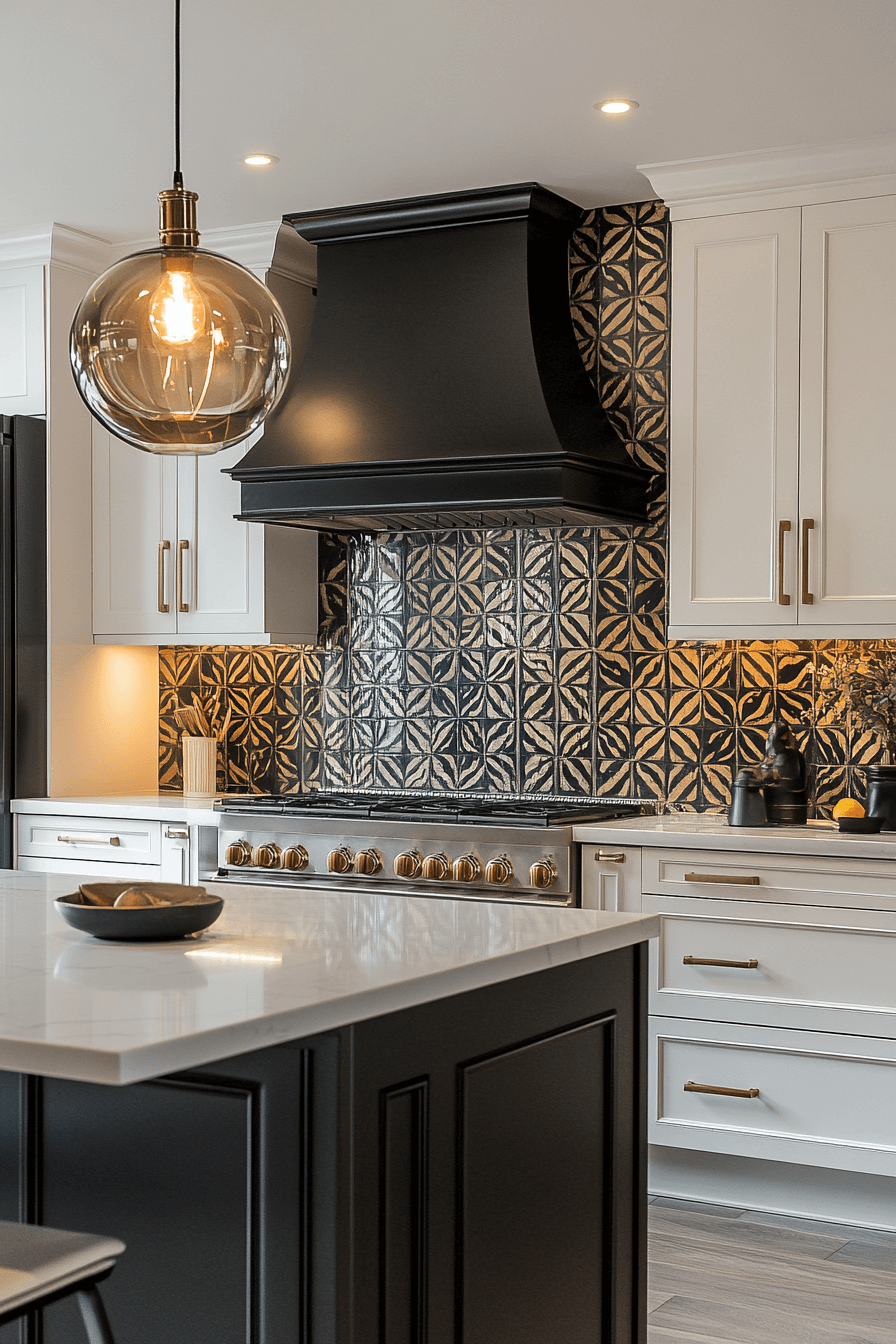 Art Deco tiles infuse backsplash kitchen ideas with vintage glam and geometric sophistication. Think symmetrical patterns, metallic finishes, and bold contrasts that capture the elegance of the 1920s. These tiles make your kitchen feel like a design-forward statement space. Perfect for eclectic, retro, or luxury aesthetics, they’re anything but ordinary. Just a touch of Art Deco turns your kitchen into a showpiece.
