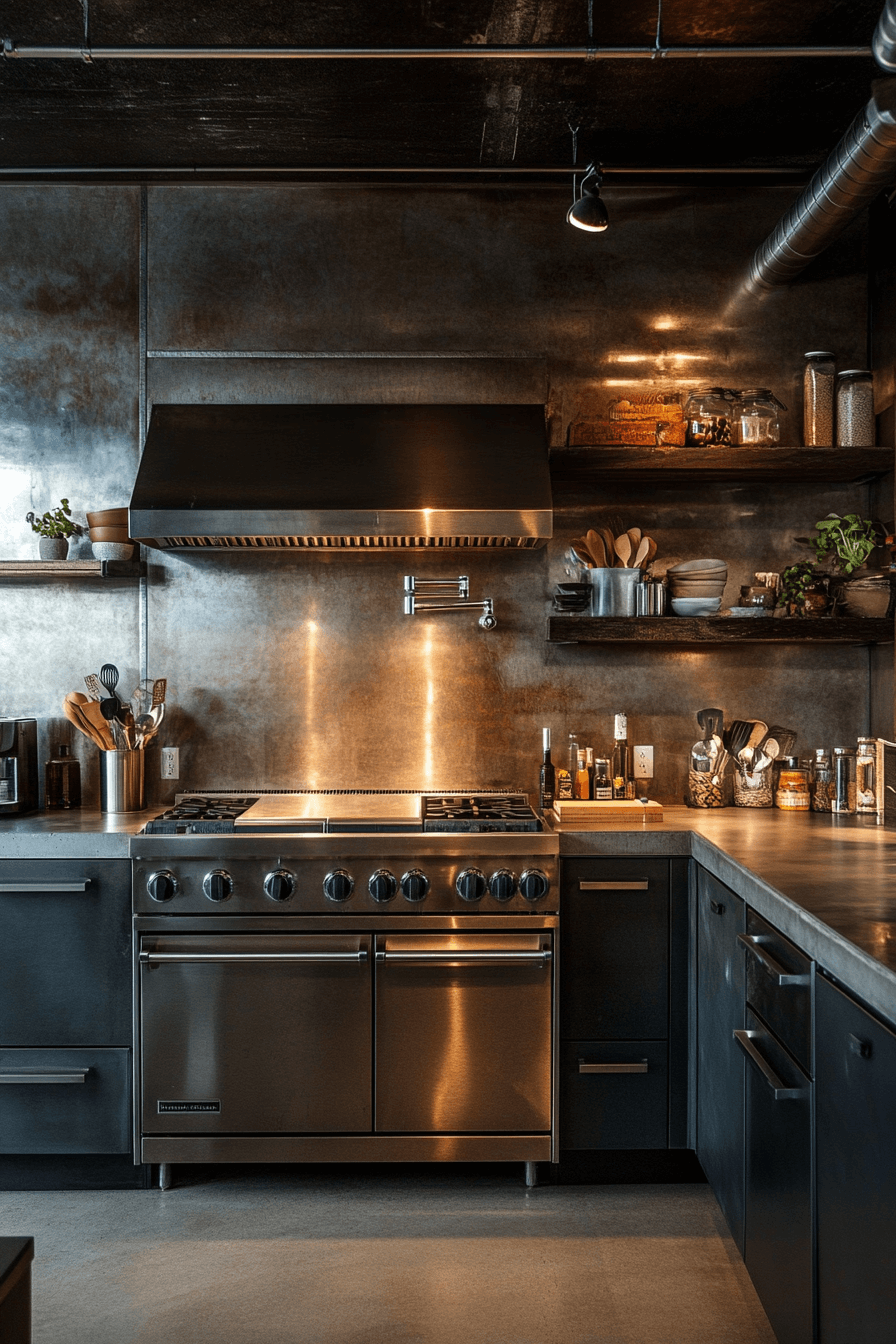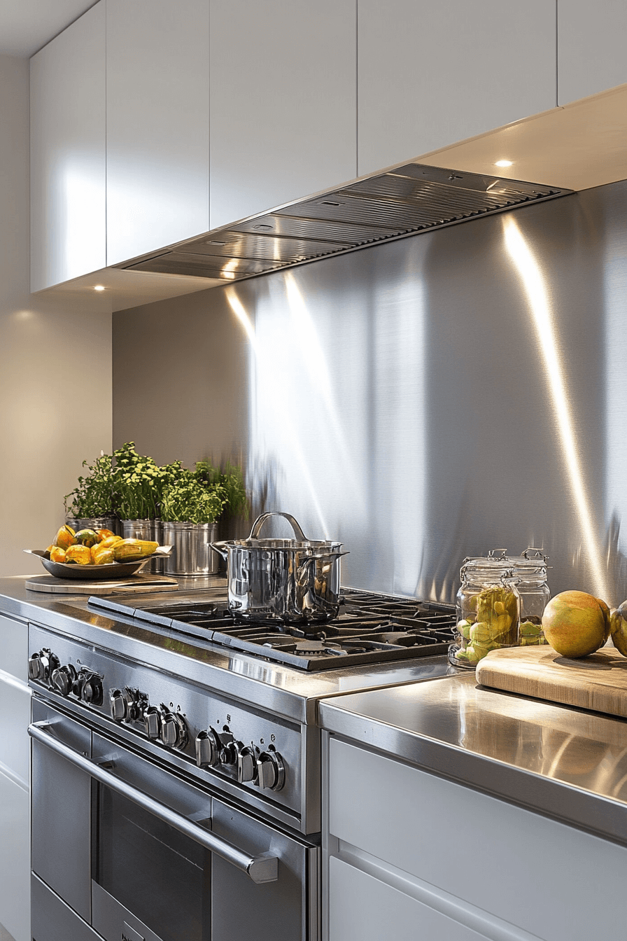 Metallic backsplashes are the go-to for anyone craving sleek and contemporary backsplash kitchen ideas. Stainless steel and brushed aluminum offer shine, durability, and a modern edge that feels fresh and professional. Their reflective surfaces make even compact kitchens feel more open and airy. Plus, they’re super easy to wipe clean—no fuss, all function. This industrial-chic style works wonders in both minimalist and urban kitchens.