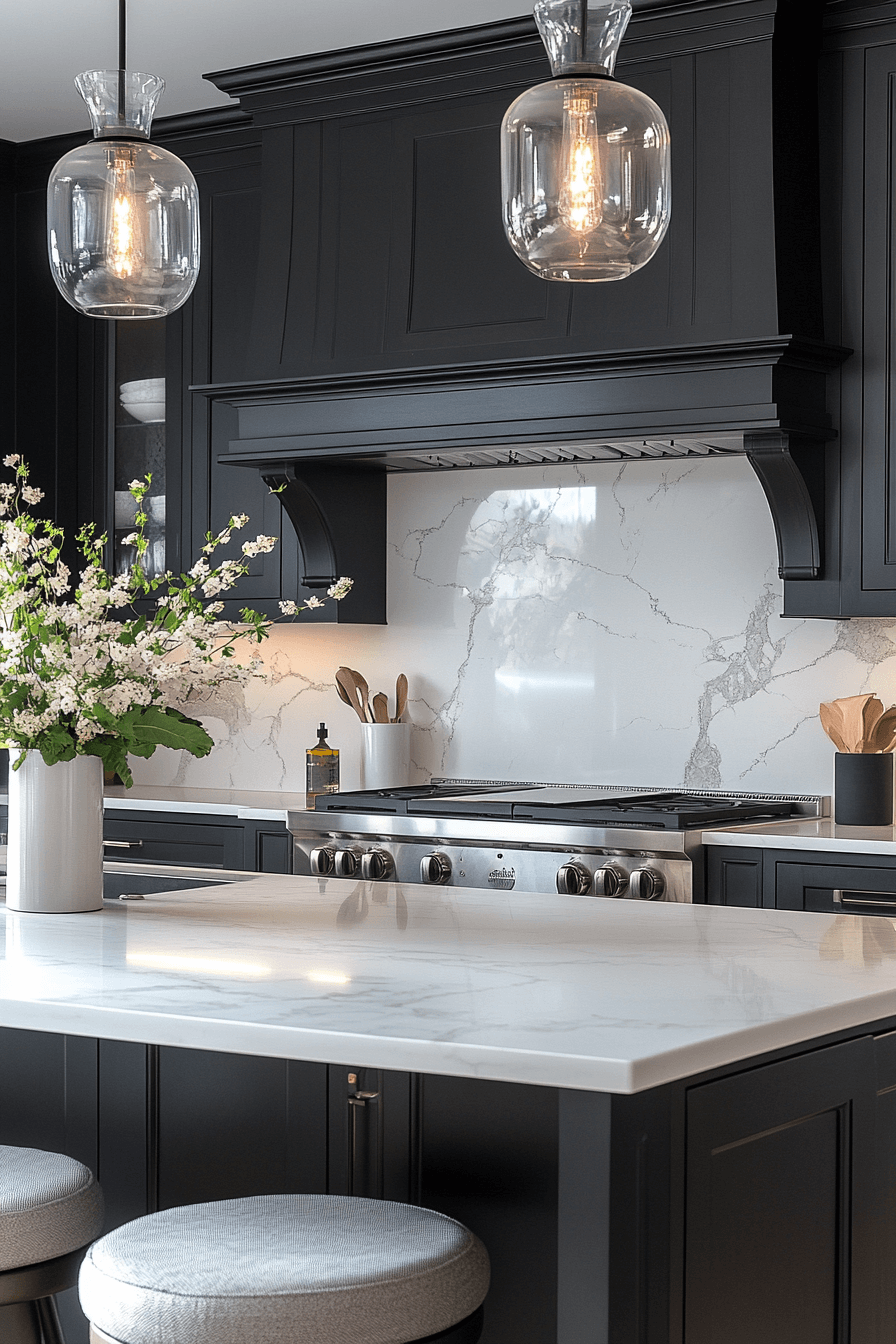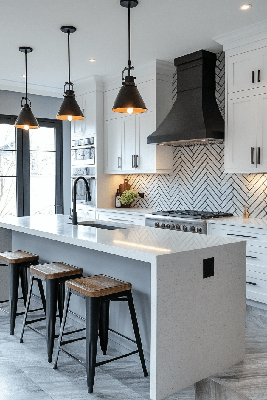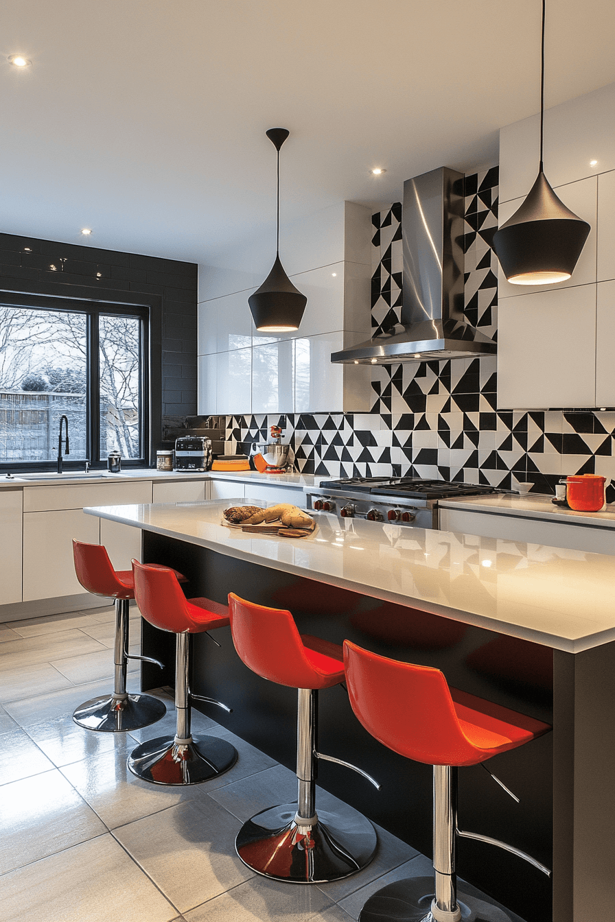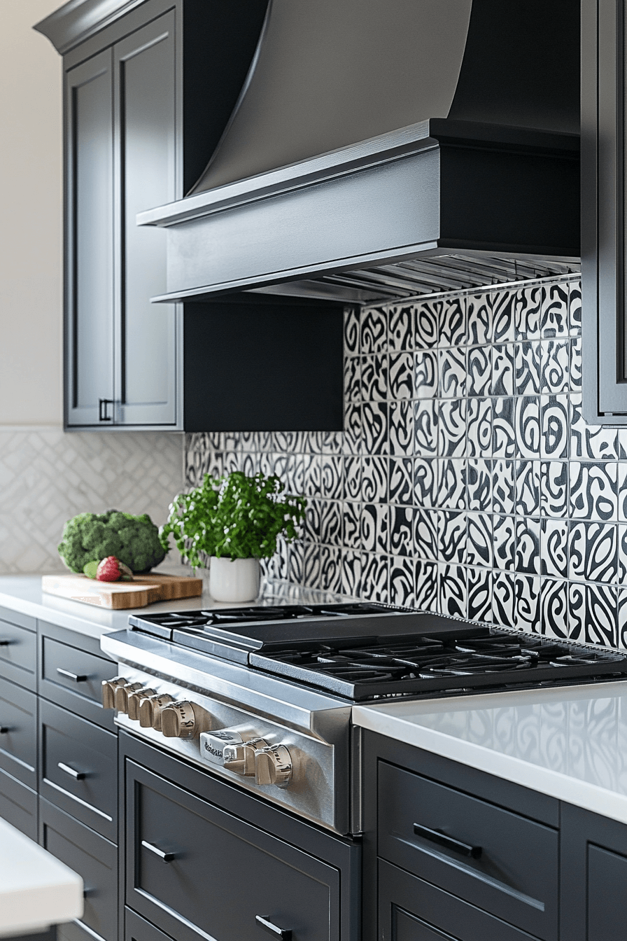 Black-and-white tiles bring high-contrast drama and undeniable style to your backsplash kitchen ideas. Whether you choose checkered patterns or bold geometric designs, this monochrome palette makes a powerful statement. It’s both timeless and trendy, working well in modern, retro, or minimalist kitchens. These tiles define the space with crisp edges and strong visual impact. The color combo makes any decor pop without overwhelming the design.