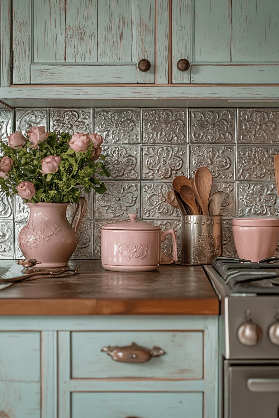 Vintage tin tiles add character and charm to backsplash kitchen ideas that lean toward nostalgic or shabby chic aesthetics. Their embossed patterns and aged patina give the kitchen an old-world appeal with a modern twist. They’re lightweight, paintable, and surprisingly easy to install. Perfect for creating a focal wall or adding texture behind open shelving. They bring heritage and heart into the kitchen in a way few materials can.