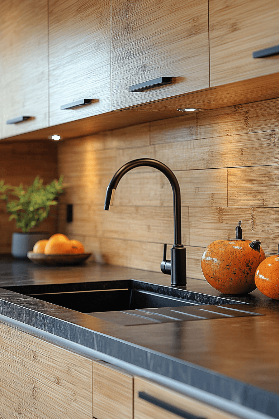 Bamboo backsplashes offer sustainable style with a warm, natural vibe perfect for eco-conscious backsplash kitchen ideas. Their fine grain and neutral tones work beautifully in both modern and boho-inspired kitchens. Bamboo panels are naturally water-resistant and easy to maintain, making them as practical as they are beautiful. They instantly create a calm and grounded feel in any cooking space. Plus, they’re a planet-friendly choice you can feel good about.
