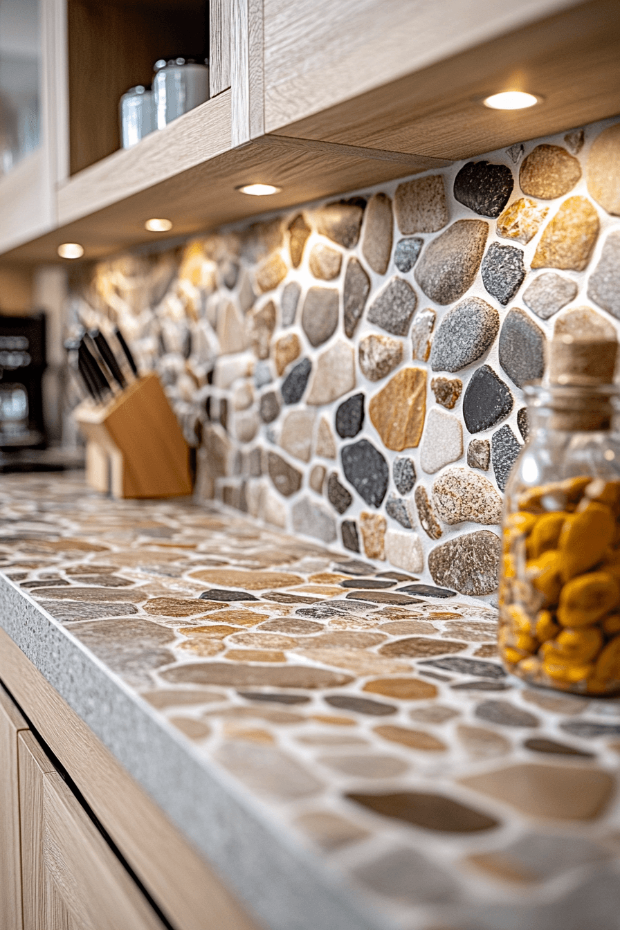 Pebble tile backsplashes bring an organic, beachy texture to backsplash kitchen ideas that crave natural charm. The smooth, rounded stones create a relaxed and tranquil atmosphere, perfect for coastal or spa-inspired kitchens. Each tile is unique, adding movement and variation to your walls. They offer a grounding, tactile experience while still being easy to clean and seal. It’s like bringing a bit of nature into your kitchen sanctuary.