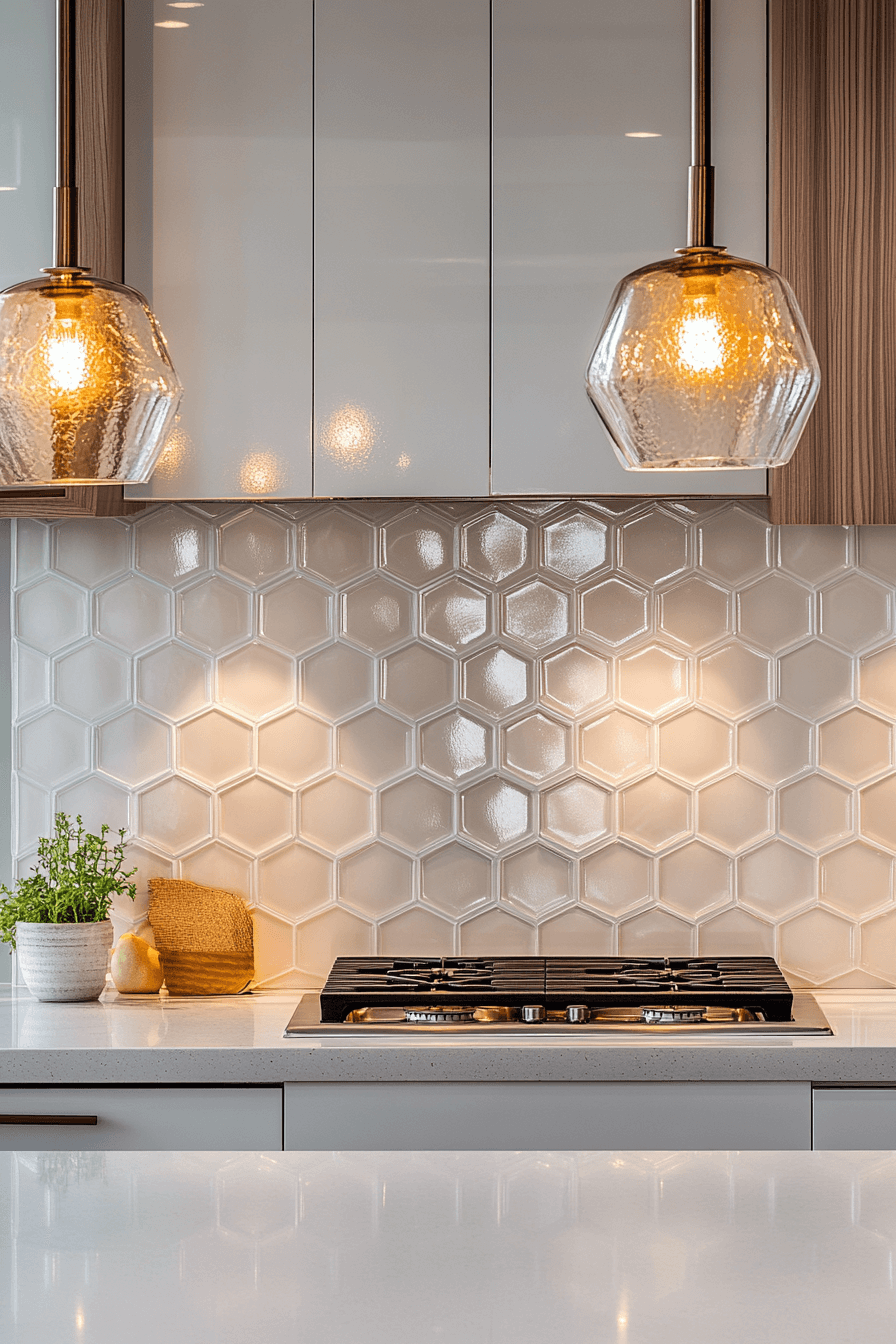 Honeycomb tiles bring a fresh, geometric twist to backsplash kitchen ideas with their charming hexagonal shape. These bee-inspired patterns add texture, movement, and subtle flair to your walls. You can keep it neutral for a clean look or play with contrasting colors for visual pop. Their repetitive symmetry is modern yet timeless, blending beautifully into contemporary or Scandinavian kitchens. They create a unique, honey-sweet backdrop that feels fun and functional.