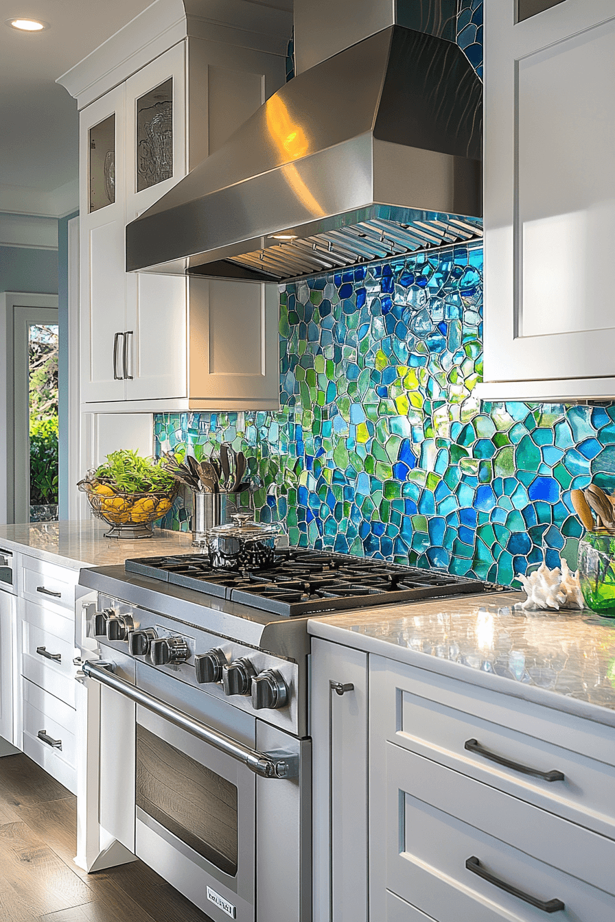 Glass mosaic tiles light up your backsplash kitchen ideas with sparkle and color in every square inch. Their reflective surfaces catch the light, making small kitchens appear larger and more alive. From subtle neutrals to bold hues, there’s a palette to suit every taste. Their smooth surface is easy to clean and maintain. This choice adds fun, flair, and functionality all in one.