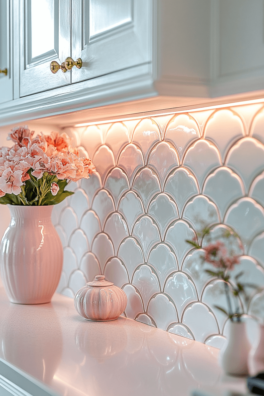 Scalloped tiles introduce soft curves and feminine elegance into backsplash kitchen ideas with their mermaid-inspired silhouette. These delicate patterns bring a romantic feel to kitchens, especially when glazed in pastels or jewel tones. The fish-scale look adds a whimsical touch while remaining classy and timeless. They work beautifully with vintage, boho, or coastal decor. It’s the perfect way to add a gentle yet stylish focal point.