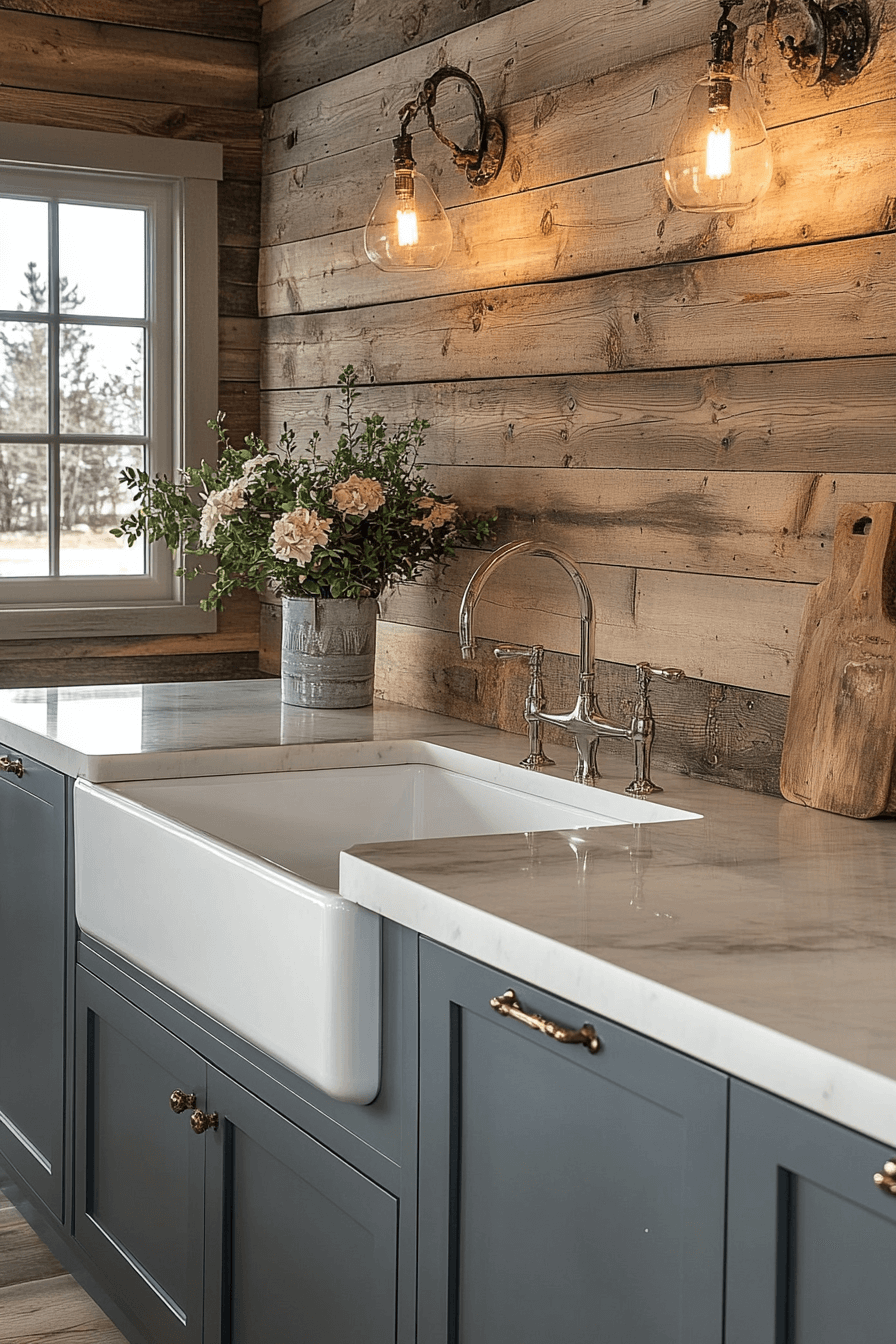 Reclaimed wood backsplashes offer texture, history, and charm for rustic-inspired backsplash kitchen ideas. Each plank tells a story with its rich grain, knots, and natural imperfections. Sealed for durability, this eco-conscious material adds warmth and authenticity to your kitchen walls. It pairs beautifully with farmhouse sinks and shaker cabinets for that lived-in look. It’s cozy, inviting, and endlessly charming.