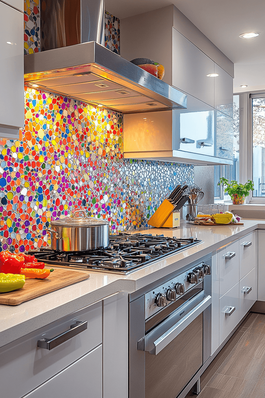 Colorful glass tiles are a joyful way to energize your kitchen and add dazzling shine to your backsplash kitchen ideas. These vibrant pieces reflect light and radiate positivity, turning your walls into a shimmering canvas. Whether you go for rainbow tones or a custom blend, they create instant wow-factor. Plus, they’re easy to wipe down and maintain a fresh look daily. It’s a brilliant choice for anyone craving playful charm.