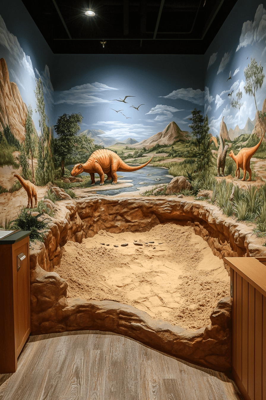 Turn your space into a prehistoric adventure with basement playroom ideas inspired by a dinosaur discovery den. Add sandboxes for fossil digging, dinosaur figures, and educational displays about ancient life. Jungle-themed decor and dino footprints on the floor make it feel immersive. Kids can explore, dig, and learn all at once. It’s a great way to combine fun with curiosity and discovery. The room feels like a mini expedition every day. Unearth more dinosaur playroom inspiration now.