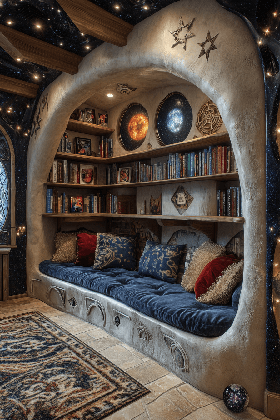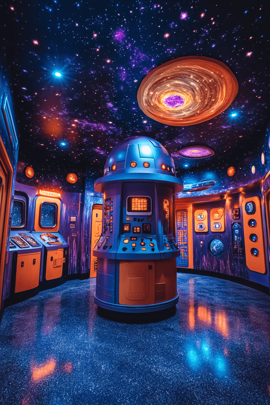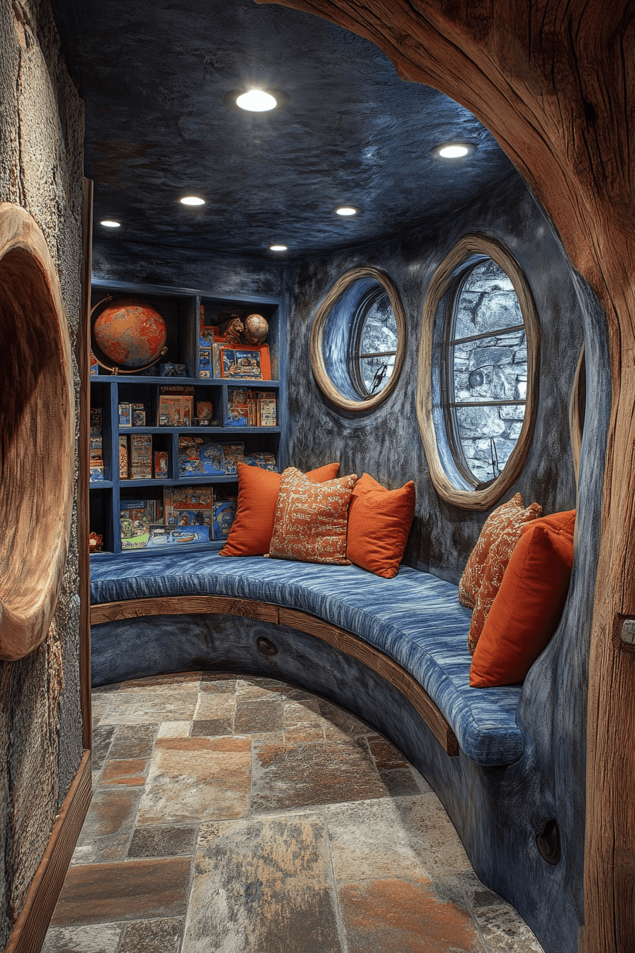 Bring the excitement of space indoors with basement playroom ideas designed around a futuristic space station theme. A play structure shaped like a spaceship, glowing stars on the ceiling, and control panels can make it feel out of this world. Add puzzles, telescopes, or science toys to mix learning with play. Dark tones paired with glowing accents help create that cosmic atmosphere. Kids can explore, imagine, and learn all in one space. It’s a fun way to spark interest in science and adventure. Discover how to create your own space-themed playroom.