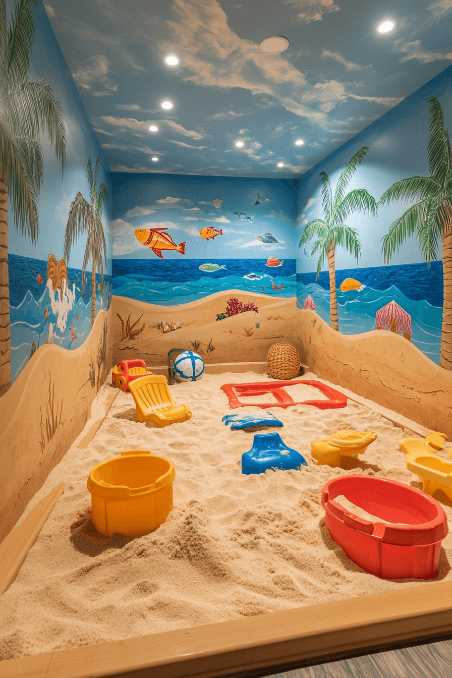 Create a sunny escape indoors with basement playroom ideas that turn your space into a beach-inspired fun zone. Add a sandbox, a ball pit for “waves,” and playful decor like palm trees and beach colors. Bright lighting helps recreate that warm, sunny feeling. Include beach toys and small seating areas for a complete experience. It’s perfect for sensory play and year-round fun. The whole space feels cheerful and full of energy. Bring the beach home—discover indoor beach playroom ideas now.