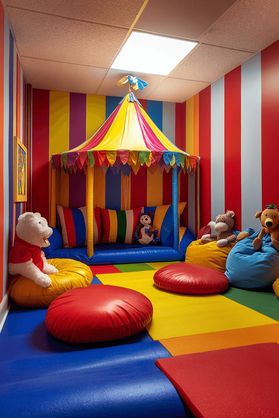 Bring high-energy fun to life with basement playroom ideas that turn your space into a colorful circus spectacular. Add playful elements like mini tents, balance beams, and open areas for juggling or performing tricks. Bright stripes, bold colors, and fun costumes make the whole room feel lively and exciting. Kids can build coordination while also enjoying creative, performance-style play. It’s a space that keeps them moving, laughing, and engaged. The atmosphere feels joyful and full of imagination. Step right up—explore circus-inspired playroom ideas now.