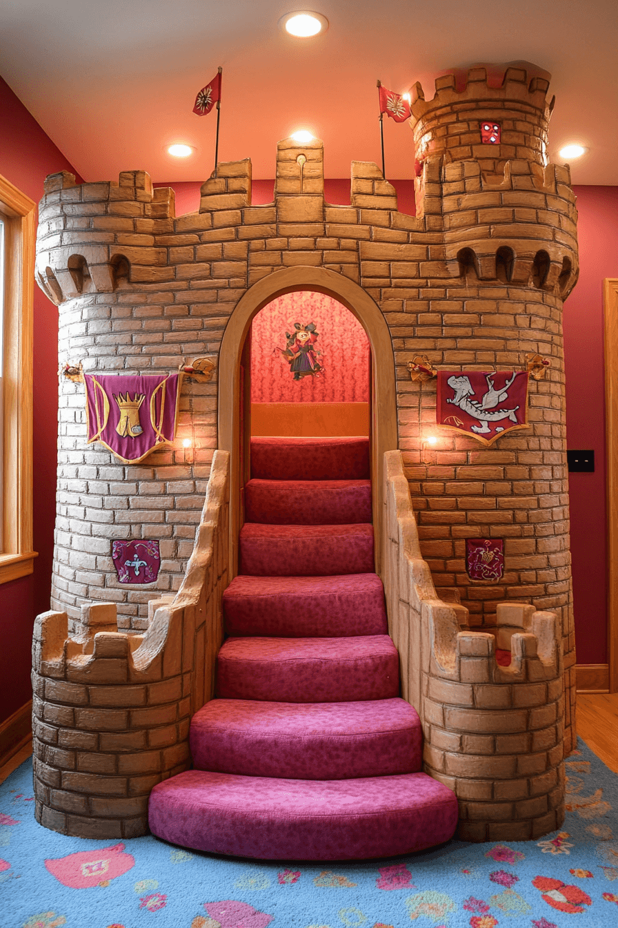 Turn your space into a magical kingdom with basement playroom ideas that bring a fairy tale castle to life. Add towers, a throne corner, and painted murals of enchanted forests to set the scene. Costumes like knights, princesses, and even dragons make the experience even more fun. Kids can create their own stories and adventures every day. The space feels imaginative, playful, and full of wonder. It’s a perfect setup for creative storytelling and role play. Step into the magic—explore fairy tale playroom ideas now.