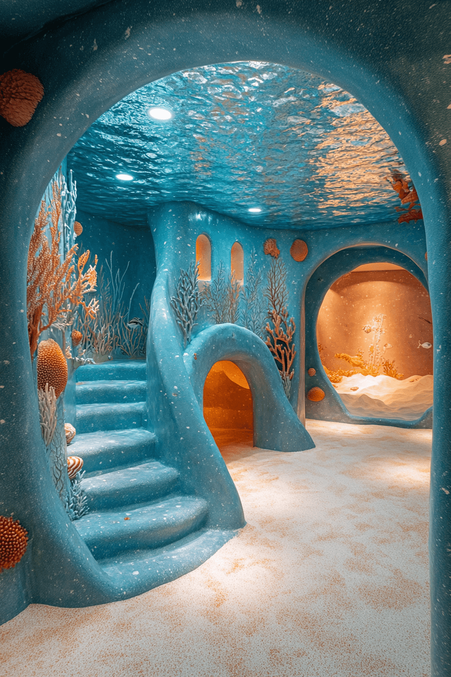 Create an underwater world right at home with basement playroom ideas that feel like a deep-sea adventure. Walls painted with ocean scenes and sea creatures can instantly set the mood. Add fun details like hidden sound elements or wave-like cushions to make it interactive. A small submarine play area can become the star of the room. This setup blends fun with learning, sparking curiosity about marine life. It’s playful, calming, and full of discovery. Tap to dive into more ocean-themed playroom inspiration.