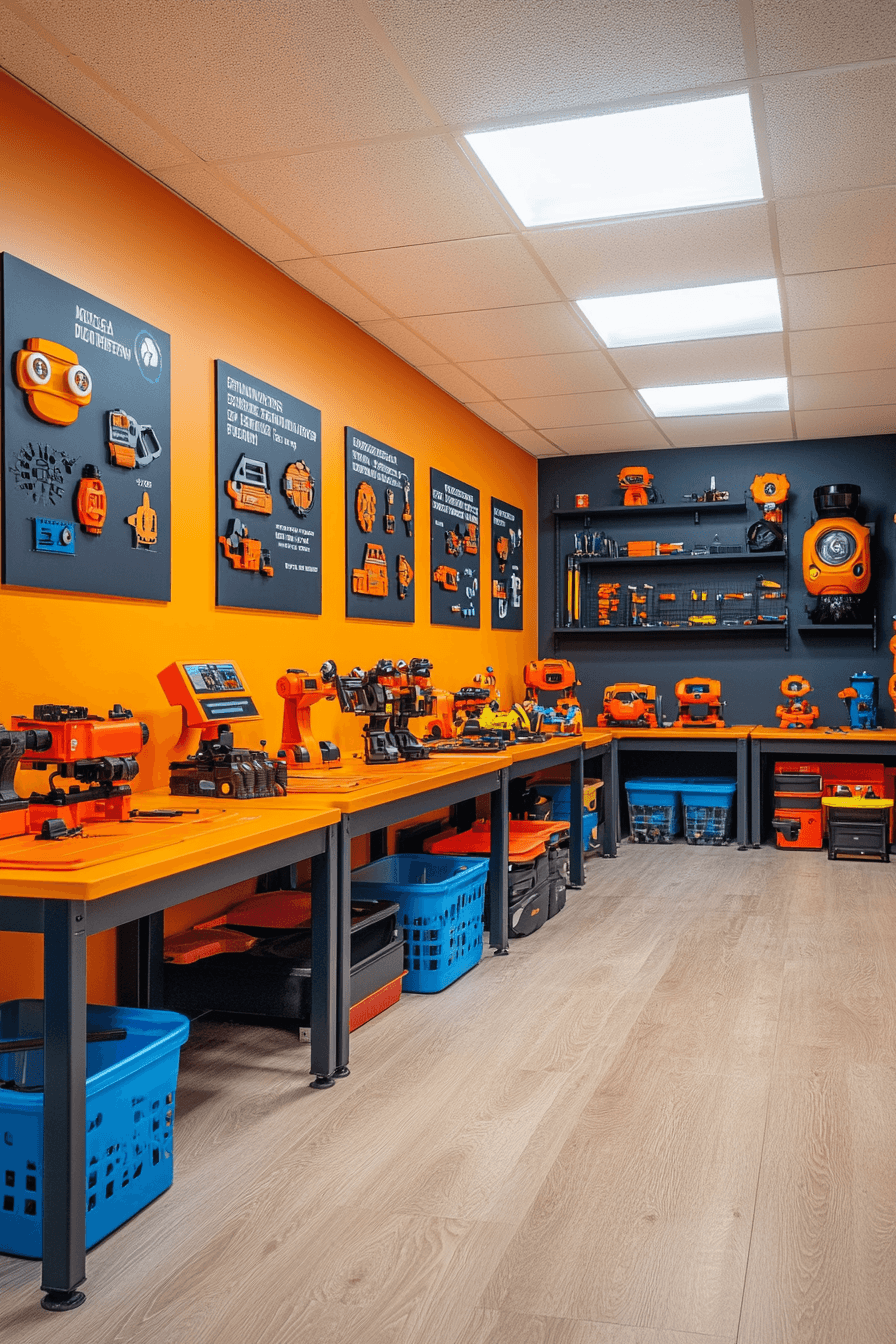 Create a hands-on learning zone with basement playroom ideas centered around a robotics workshop. Set up a workbench with building kits, tools, and storage for projects. Bright colors and tech-inspired decor keep the space exciting and engaging. Kids can build, experiment, and learn new skills through play. It’s a great way to spark interest in science and engineering early on. The room feels both fun and educational at the same time. Power up creativity—discover robotics playroom ideas today.