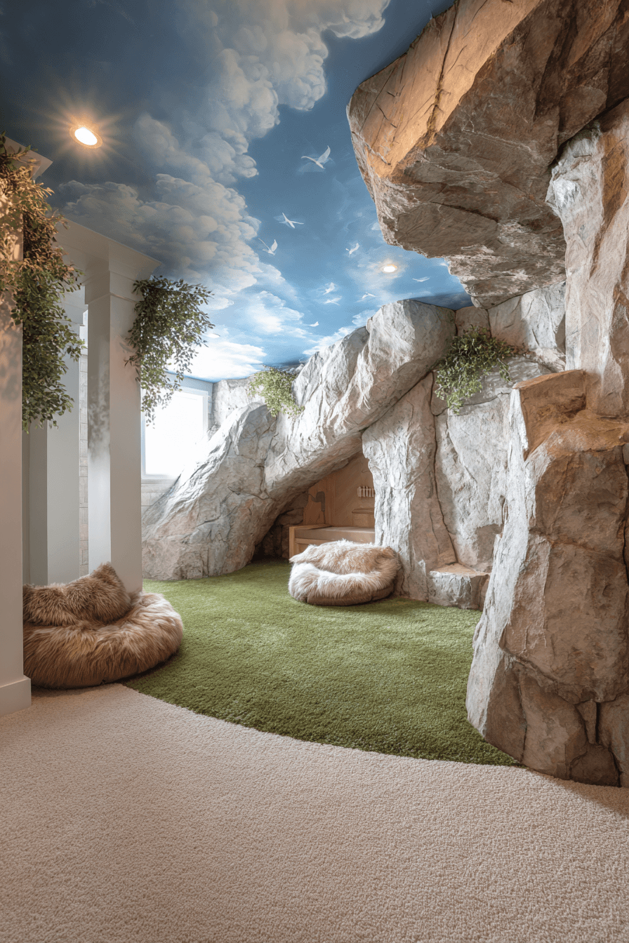 Bring the outdoors inside with basement playroom ideas that create a nature-inspired retreat. A treehouse-style structure, small climbing wall, and natural textures make the space feel adventurous. Use materials like wood and stone, along with greenery, to enhance the look. The setup encourages kids to explore and connect with nature. It feels calm, creative, and full of discovery. It’s a great balance between play and learning. Get inspired by nature-themed playroom designs now.