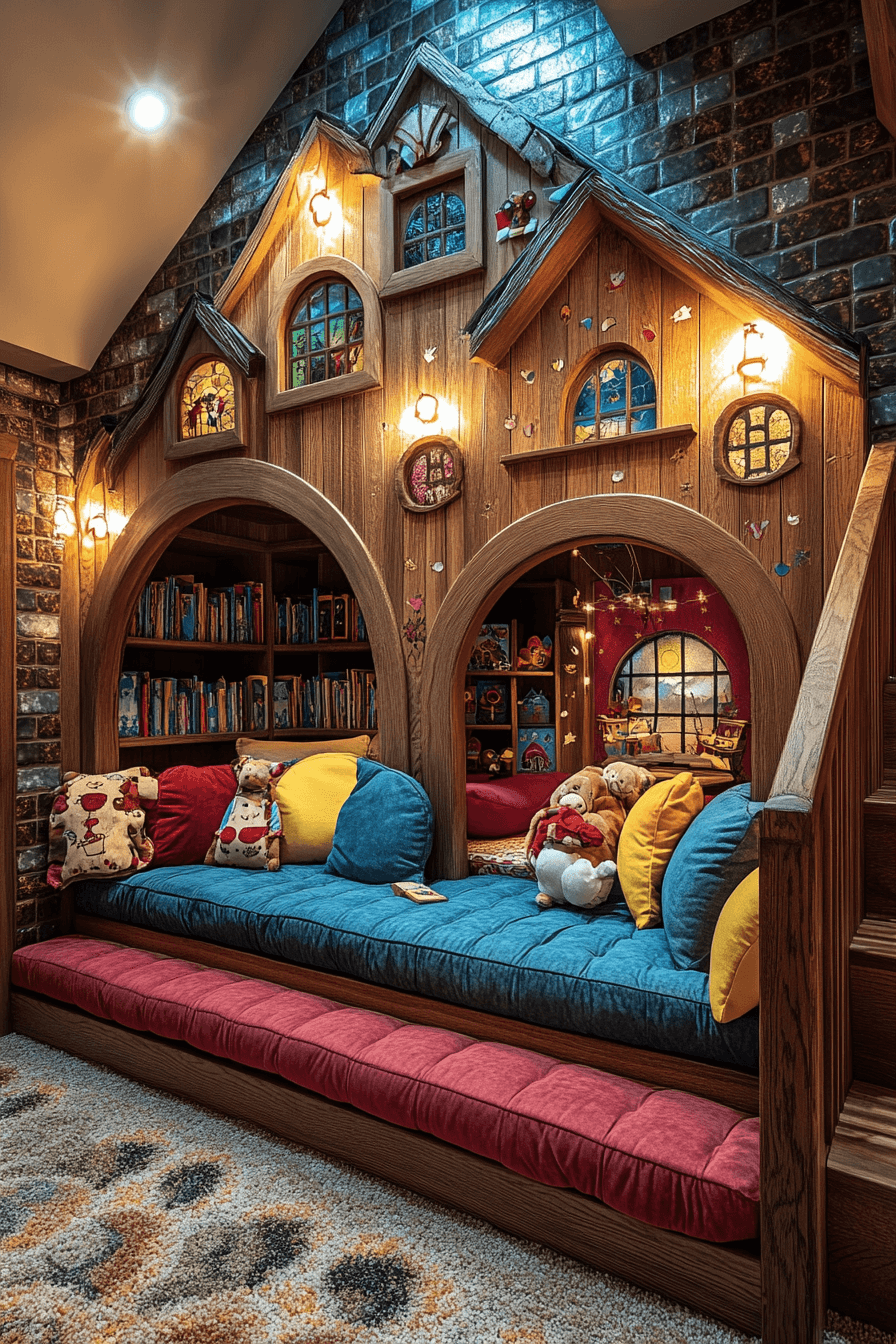 Bring a touch of magic into your home with basement playroom ideas designed as a wizard’s library. Fill shelves with fantasy books, add a potion-mixing station, and decorate with mystical details like globes and star maps. A cozy reading nook with soft seating makes it even more inviting. The space feels warm, imaginative, and full of wonder. It’s perfect for kids who love stories and magical adventures. Every corner sparks curiosity and creativity. Cast your design spell—explore wizard-themed playroom ideas today.