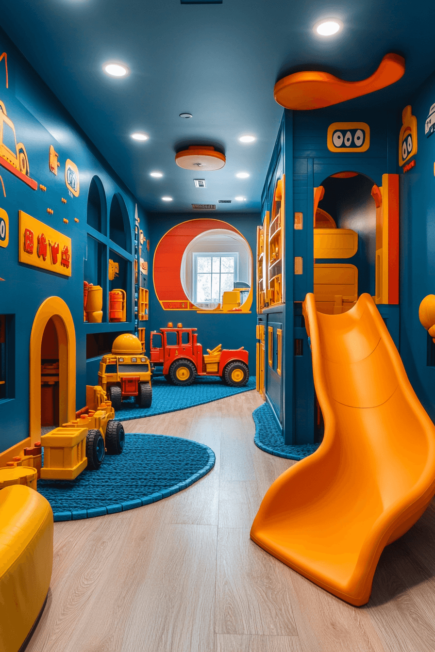 Build a fun and interactive zone with basement playroom ideas focused on construction and creativity. Use foam blocks, building toys, and open floor space for creating structures. Add decor inspired by cities and construction sites to set the tone. Kids can build, stack, and collaborate on new designs. It’s a great way to develop motor skills and teamwork. The space feels active and hands-on. Start building big ideas—check out construction-themed playroom inspiration now.