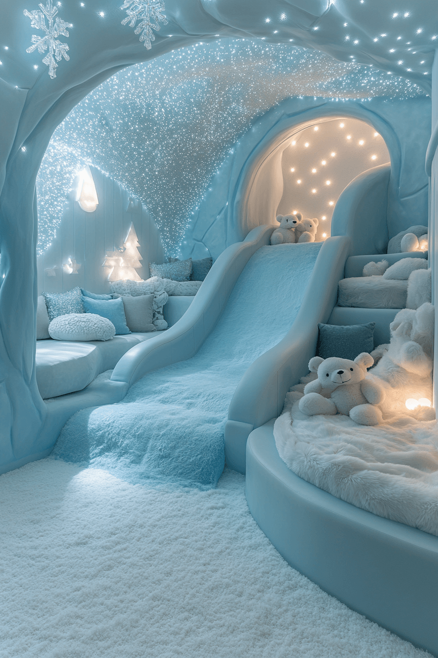 Create a cool and magical escape with basement playroom ideas inspired by a winter wonderland. Add faux snow, icy blue decor, and playful features like slides or skating areas. Include igloos and arctic animal toys to complete the theme. The space feels bright, fun, and completely unique. It’s perfect for imaginative play no matter the season. Kids can enjoy a snowy adventure all year long. Chill into creativity—explore winter-themed playroom ideas now.