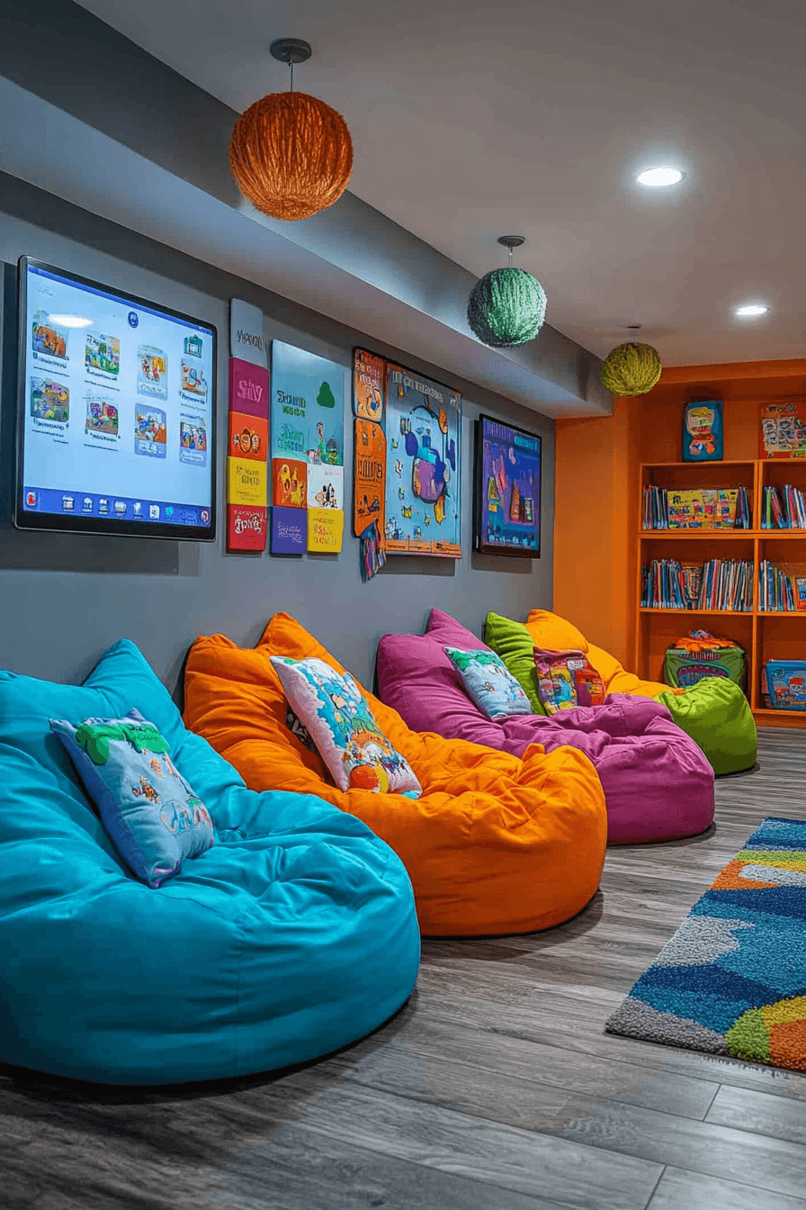 Design a space where learning feels like play with basement playroom ideas focused on creativity and exploration. Chalkboard walls, interactive floors, and hands-on activity zones make the room dynamic and engaging. You can include areas for reading, crafting, and STEM projects all in one place. The layout keeps kids curious and excited to try new things. It’s perfect for blending education with fun in a natural way. The room grows with your child’s interests over time. Explore more ways to create a playful learning environment.