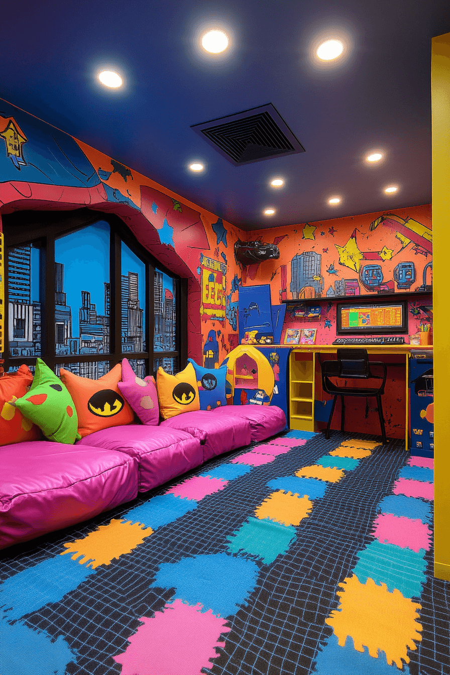 Bring action and excitement into your home with basement playroom ideas centered around a superhero headquarters. Set up costumes, props, and a mini cityscape where kids can act out their favorite heroic missions. Interactive features like a command center with lights and pretend controls add even more fun. This setup encourages teamwork, creativity, and active play. It’s perfect for kids who love adventure and saving the day. The energy in the room will be nonstop excitement. Suit up and start designing your superhero play space now.