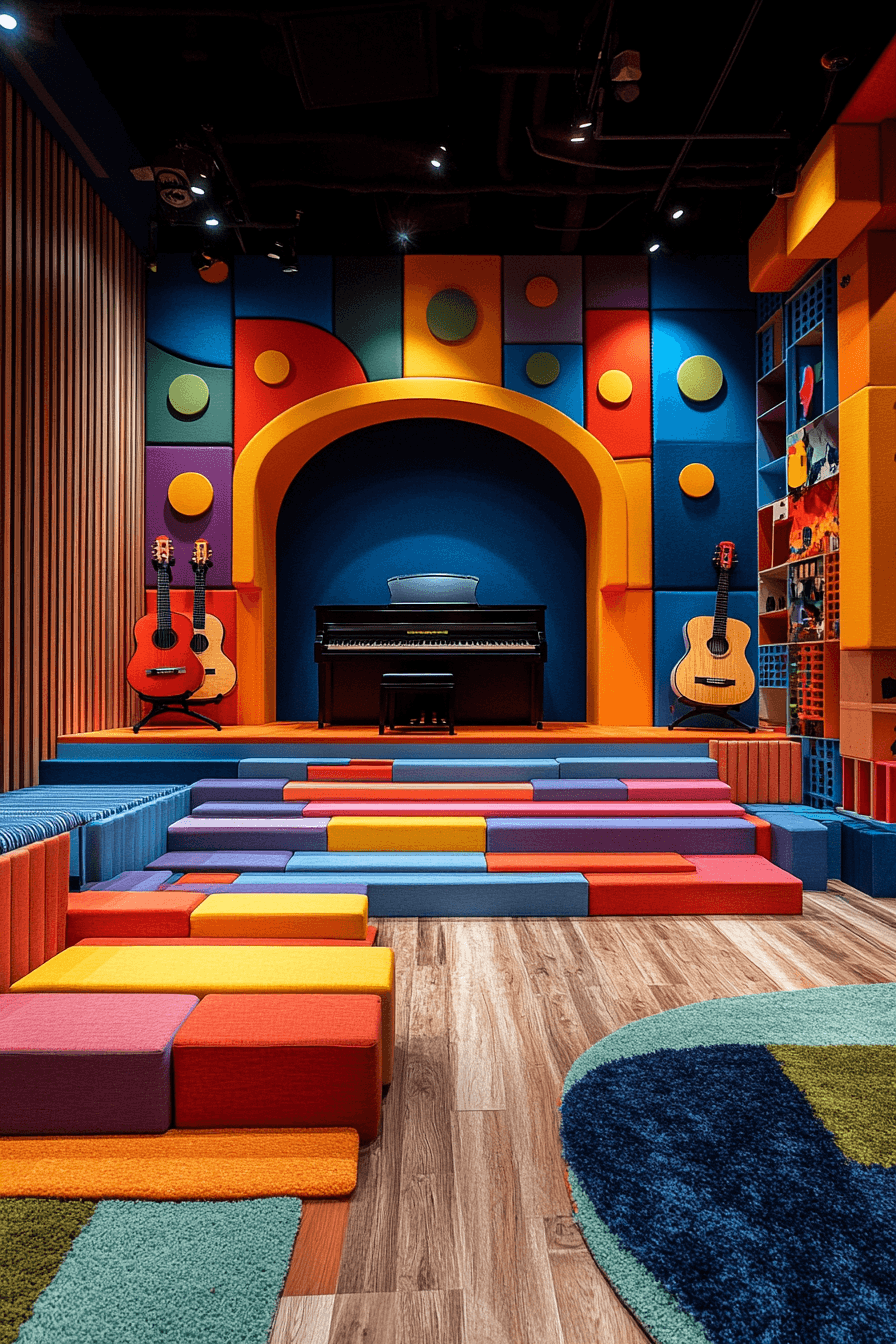 Turn your basement into a creative sound zone with basement playroom ideas built around a music room. Fill the space with instruments, cozy seating, and an area for mini performances. Soundproofing helps keep things fun without getting too loud upstairs. Older kids can experiment with recording equipment and explore their creativity even more. Bright colors and soft textures make the room feel lively and welcoming. It’s a great mix of fun and learning for all ages. Tune into creativity—discover music room ideas for your playroom.