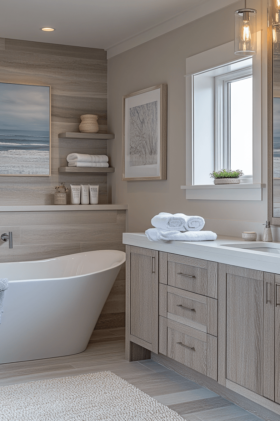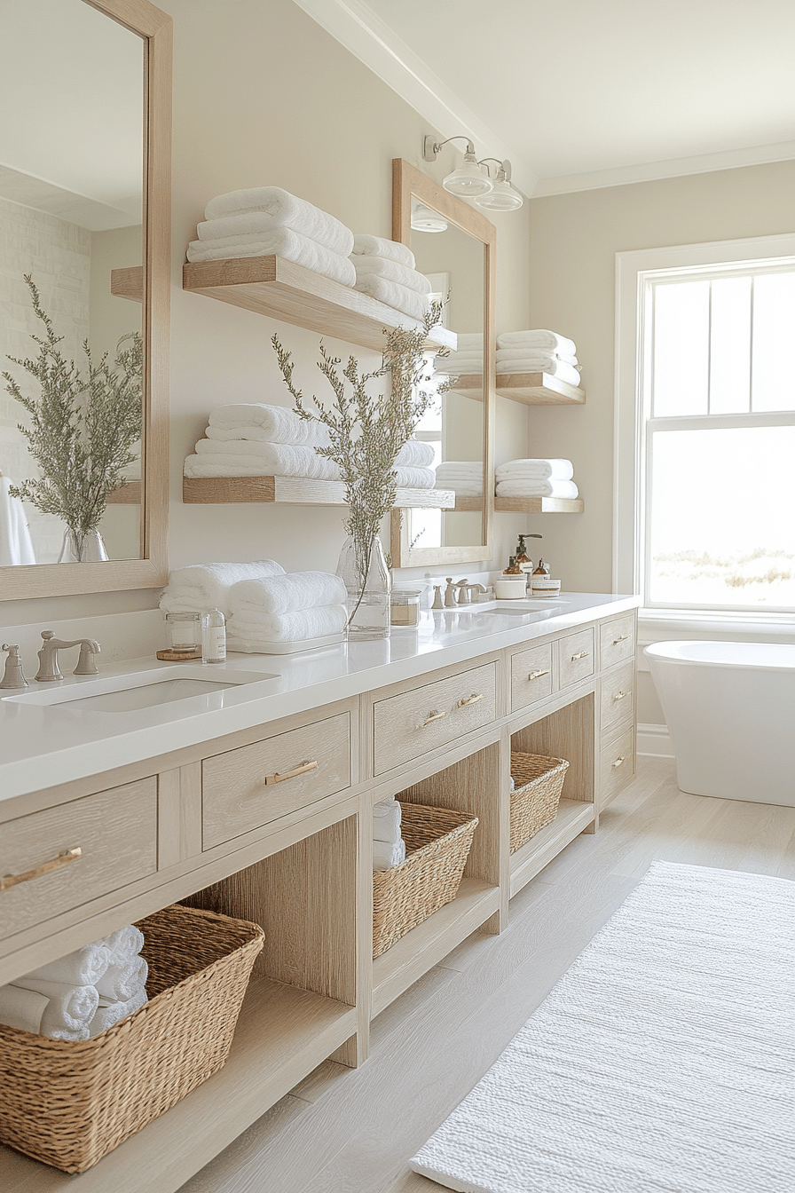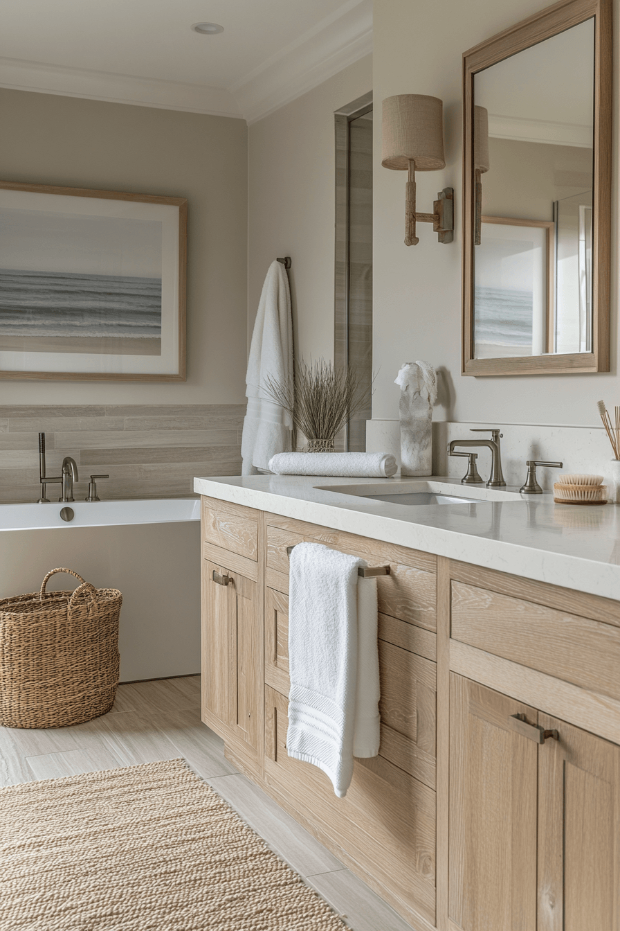 A light and airy layout transforms your space into a refreshing, open retreat filled with soft neutrals and effortless flow. This beach house bathroom style shines by maximizing brightness and creating a sense of calm from the moment you step inside. Oversized mirrors reflect sunlight beautifully, making the room feel expansive and uplifting. Pale wood finishes and gentle textures add warmth without weighing down the design. Every detail works together to create a space that feels like a deep breath of ocean air. Try this look and instantly elevate your daily routine.