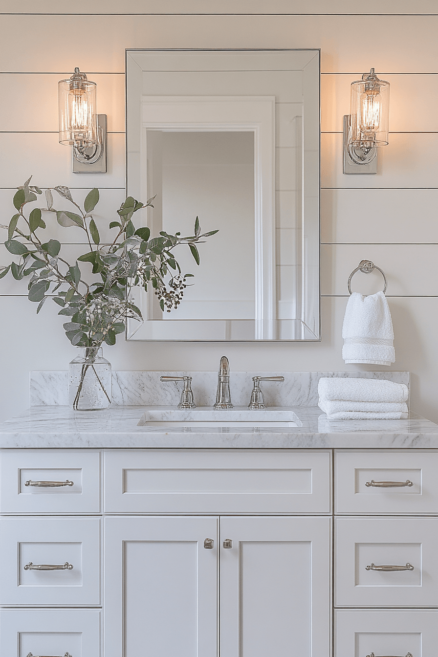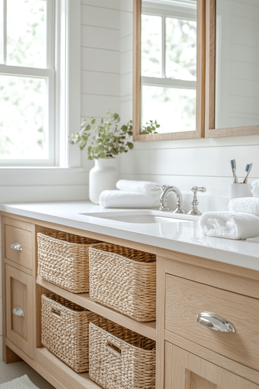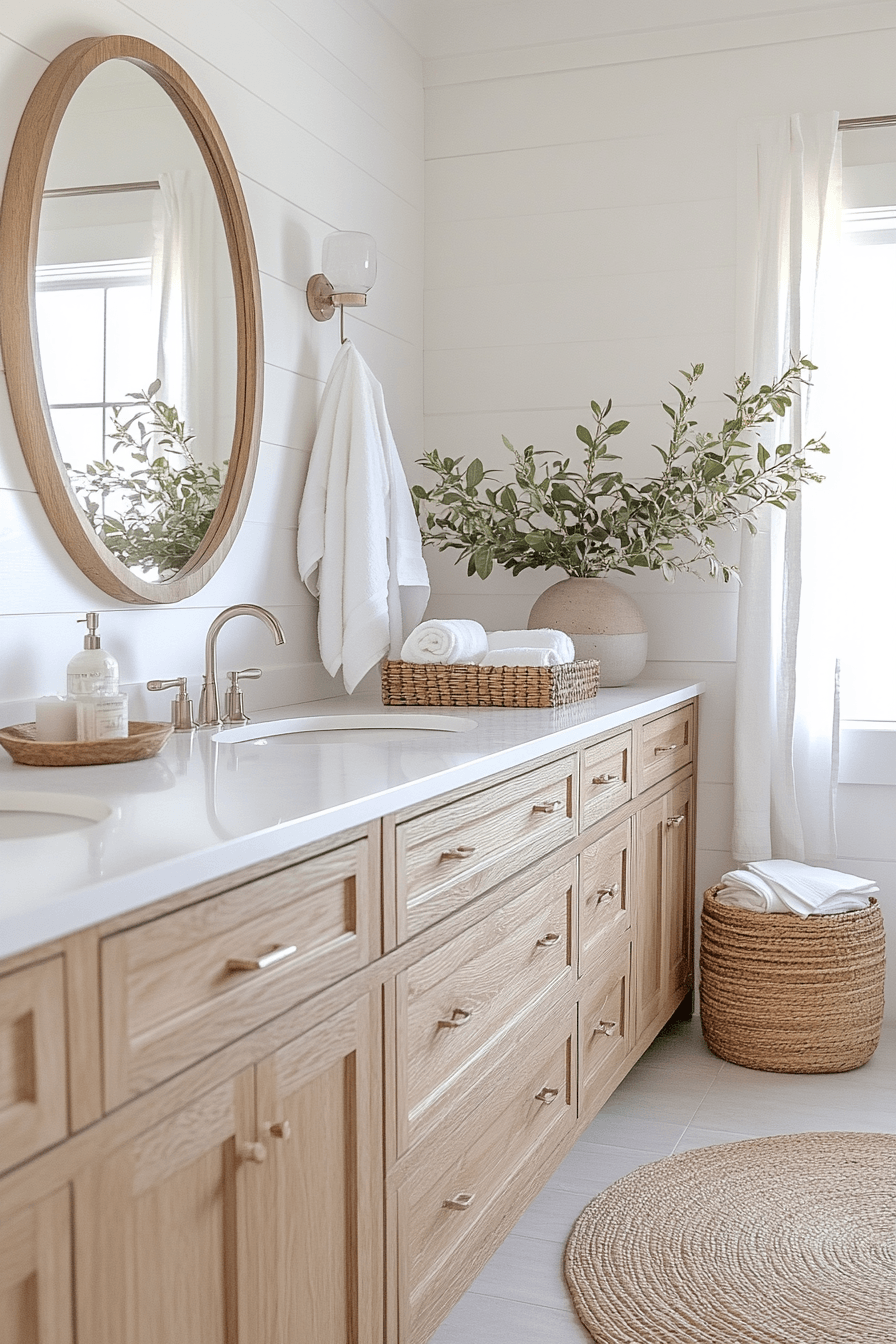 A light and airy layout transforms your space into a refreshing, open retreat filled with soft neutrals and effortless flow. This beach house bathroom style shines by maximizing brightness and creating a sense of calm from the moment you step inside. Oversized mirrors reflect sunlight beautifully, making the room feel expansive and uplifting. Pale wood finishes and gentle textures add warmth without weighing down the design. Every detail works together to create a space that feels like a deep breath of ocean air. Try this look and instantly elevate your daily routine.