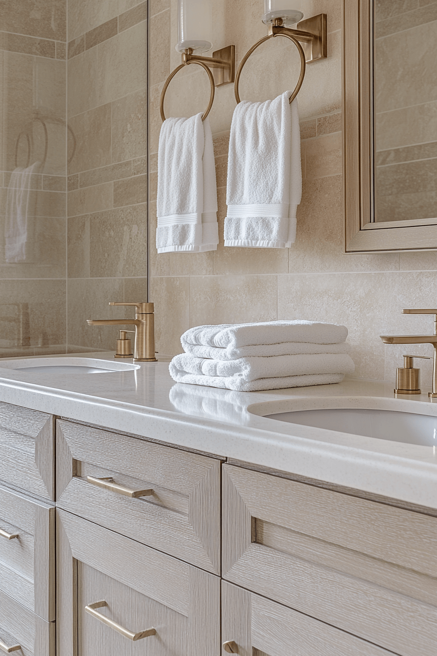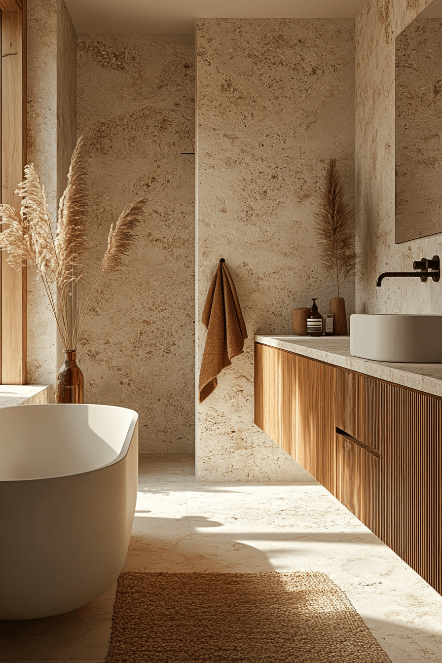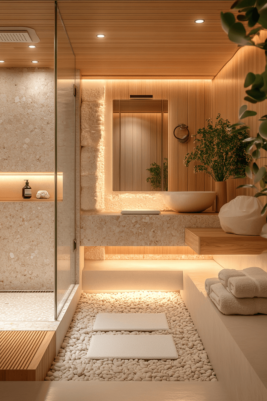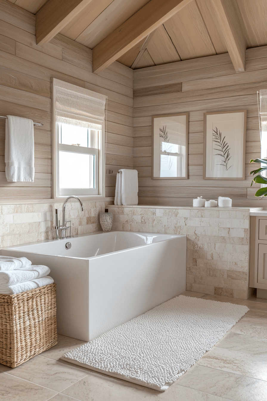 A sunwashed coastal spa embraces soft whites, warm sandy tones, and sunlight streaming through airy windows. In a beach house bathroom, this approach keeps the space feeling open, relaxed, and effortlessly bright. Light oak vanities, creamy tiles, and plush white towels help recreate that upscale seaside resort look. The gentle color palette reflects light beautifully, making even compact spaces feel more expansive. Woven textures and minimal glass accents add warmth while keeping the design clean and modern. Discover how to bring this calming spa-like atmosphere into your own home today.