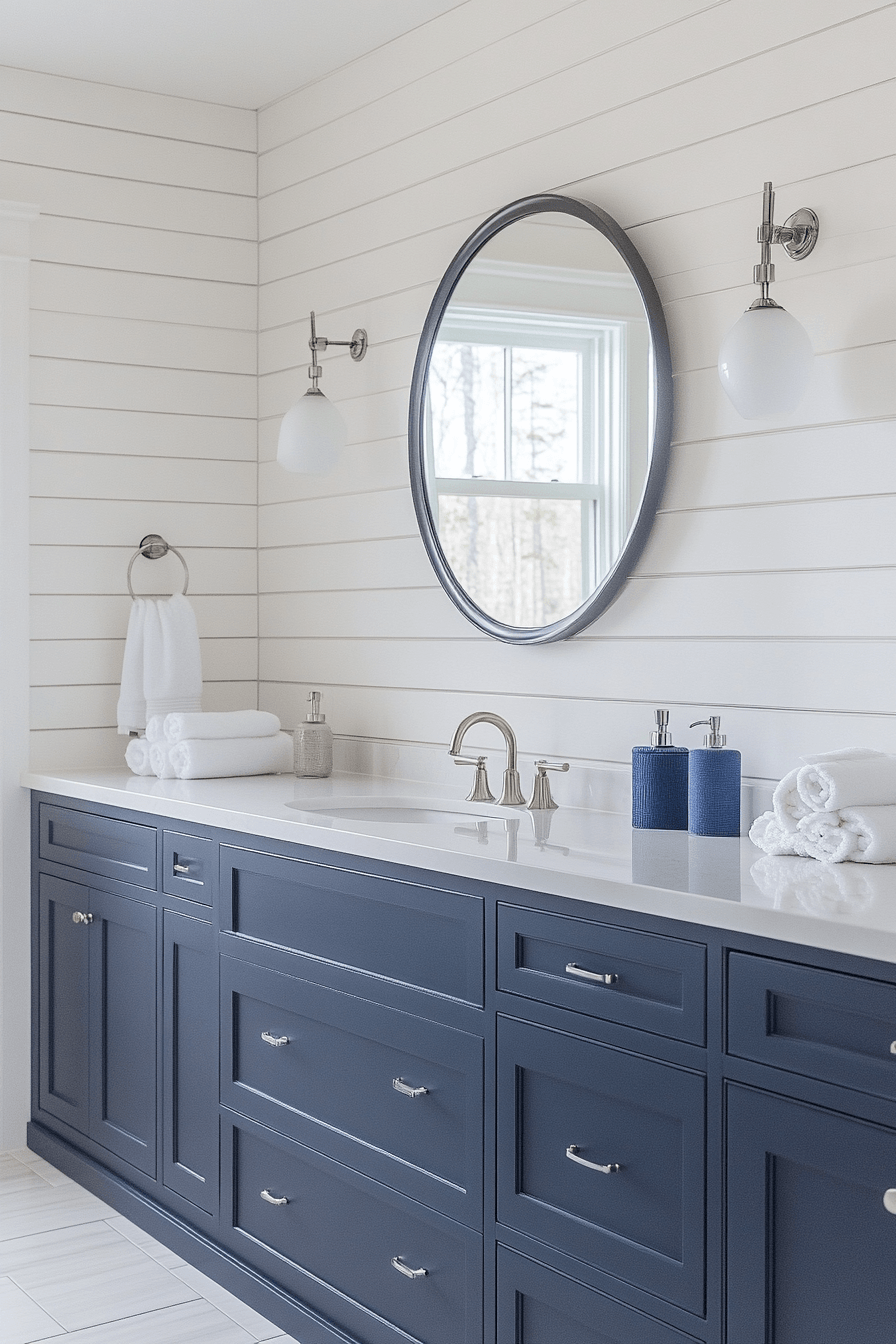 A sleek coastal update on classic nautical style adds just the right amount of contrast and character. In a beach house bathroom, deep navy touches paired with crisp white create a bold yet balanced look. Streamlined fixtures and smooth finishes keep everything feeling current and fresh. The maritime influence is subtle, so it feels elevated rather than overly themed. This approach blends structure with softness in a really appealing way. Try this modern coastal mix and bring a fresh edge to your bathroom.