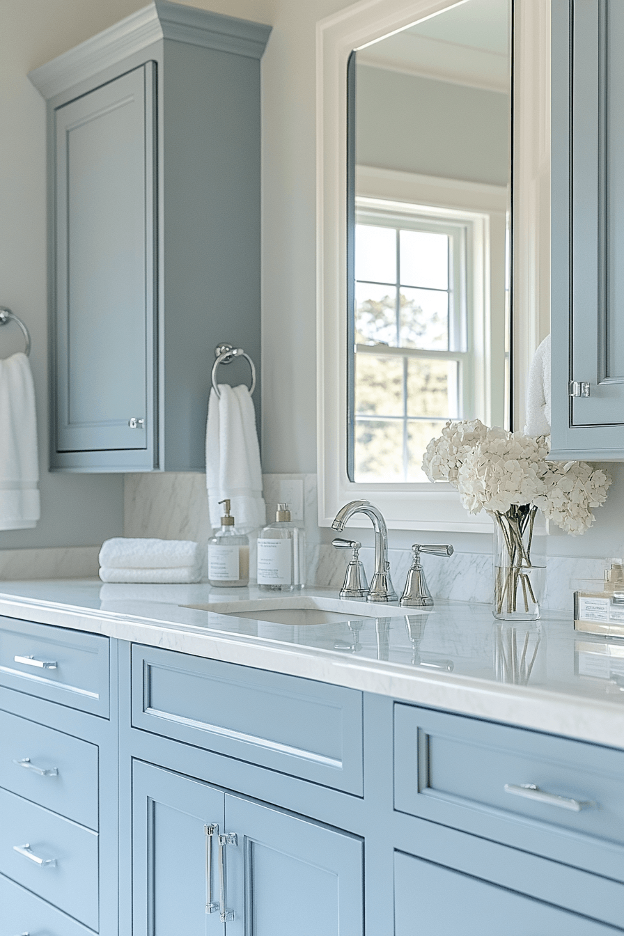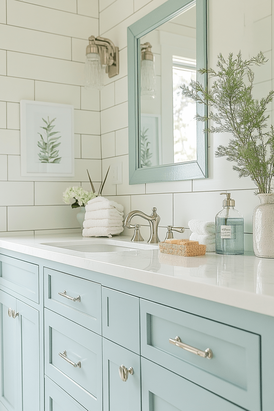 Soft ocean-inspired tones add just the right amount of color without overwhelming the space. In a beach house bathroom, gentle gray-blue hues bring a subtle coastal feel that stays refined and timeless. Paired with white surfaces and clean-lined mirrors, the look feels crisp and polished. The cool tones reflect light beautifully, keeping everything bright and fresh. It’s an understated way to bring coastal character into your design. Refresh your vanity area with this soft ocean-inspired palette and enjoy the upgrade.