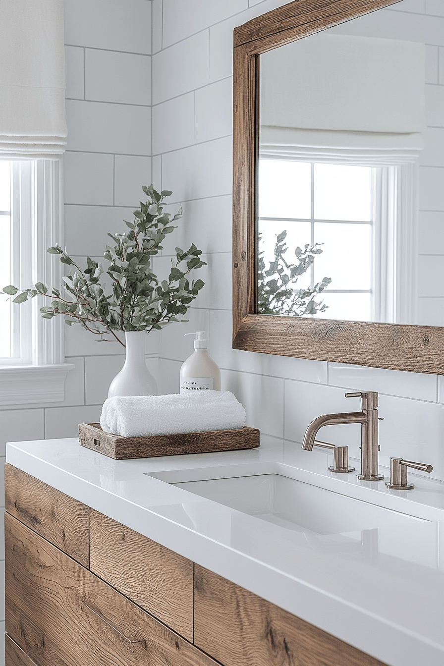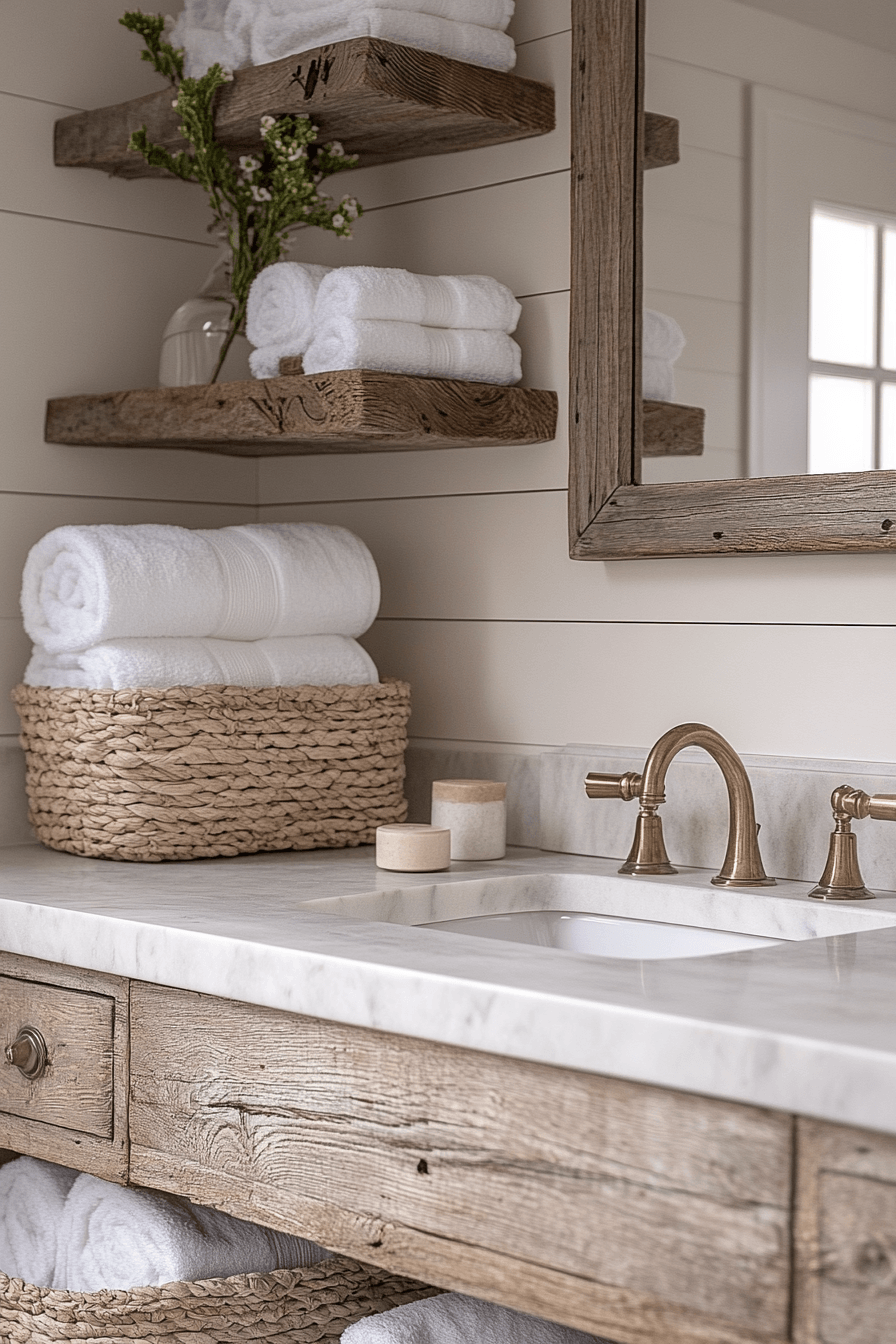 Driftwood chic styling blends weathered wood tones with soft neutrals for a relaxed, grounded feel. In a beach house bathroom, driftwood-inspired vanities or shelving add character without overwhelming the design. The natural wood textures contrast beautifully with smooth tiles and polished fixtures. This balance creates a space that feels both rustic and modern at the same time. Crisp white walls keep everything light, airy, and refreshing. Bring this effortlessly coastal look into your home and refresh your space with ease.