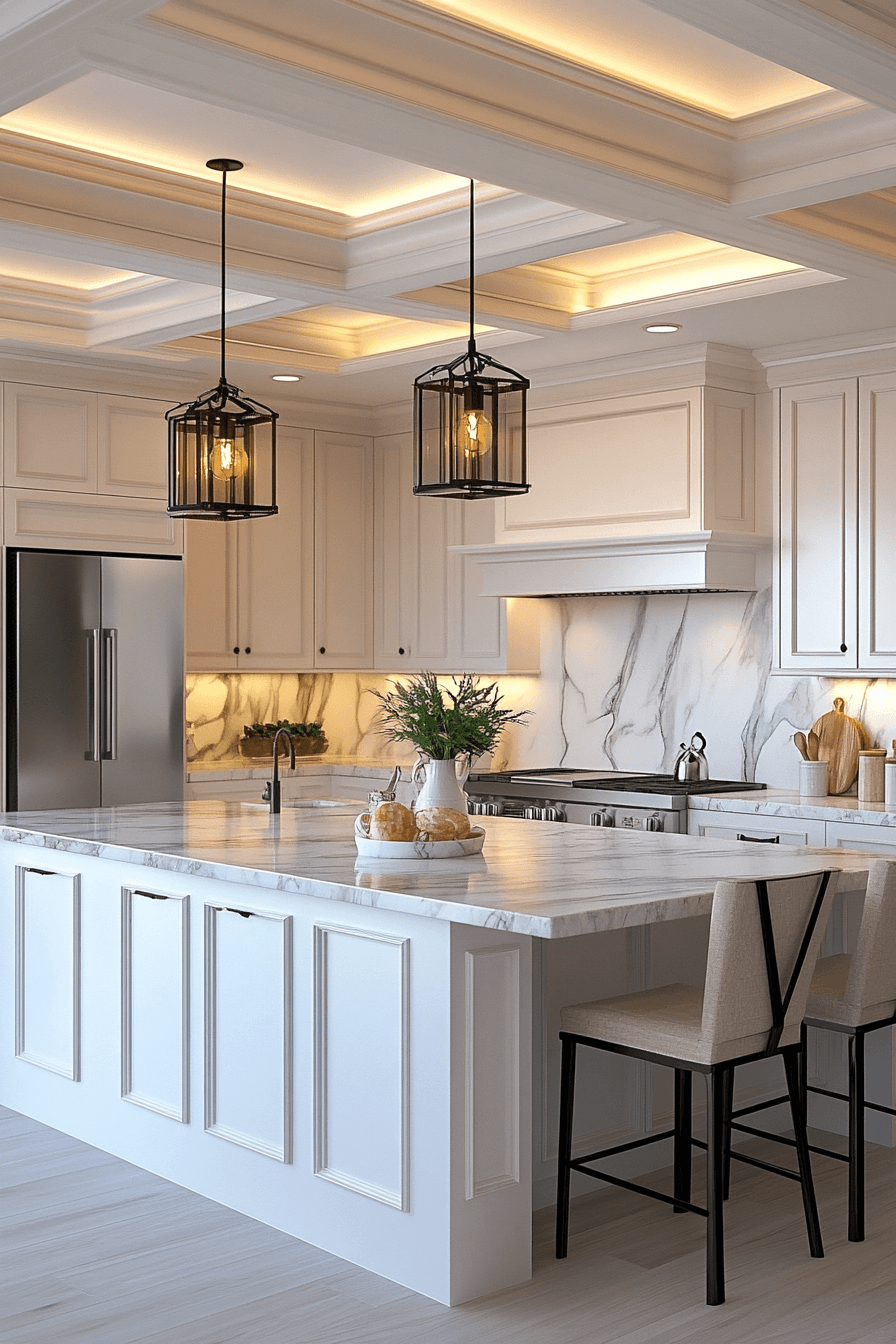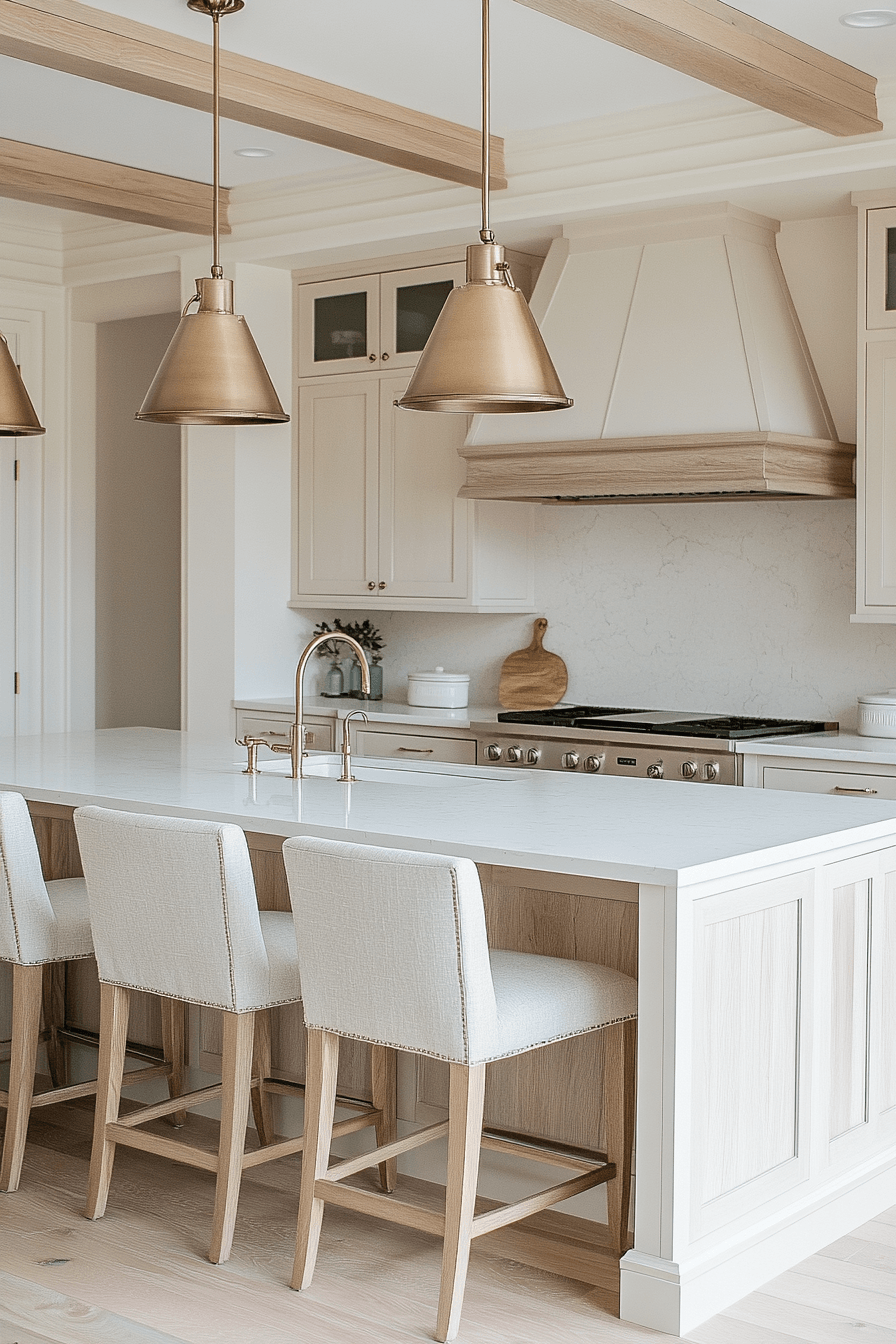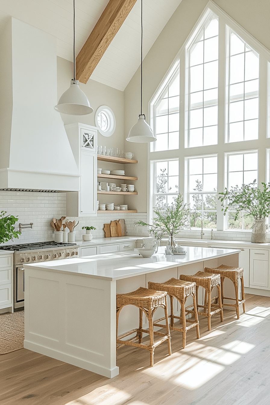 A bright, all-white space creates that effortless, airy feel that makes a beach house kitchen so inviting. Crisp cabinetry reflects sunlight beautifully, helping the entire room feel open and fresh. When paired with light wood floors and subtle coastal touches, the look stays warm without feeling plain. This style works especially well in a beach house kitchen because it lets natural light and outdoor views take center stage. The overall design feels timeless, easy to update, and always in style. Bring this breezy white aesthetic into your space and see the transformation.