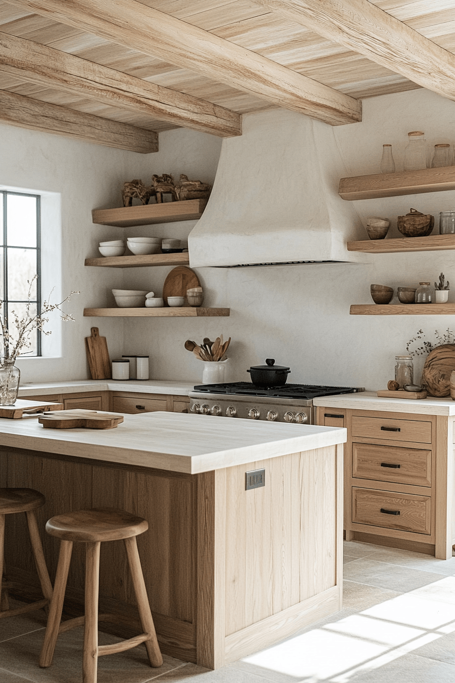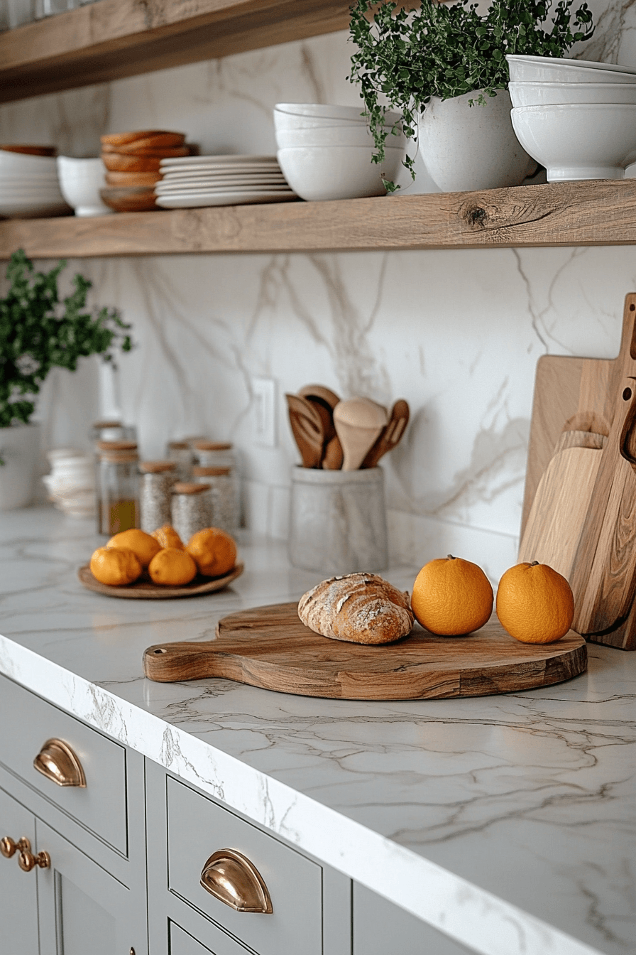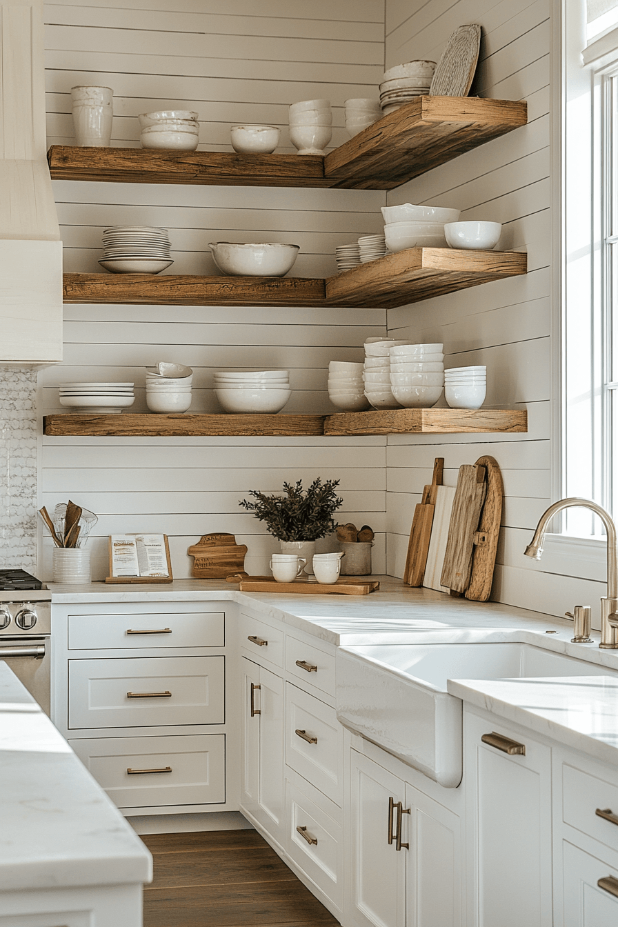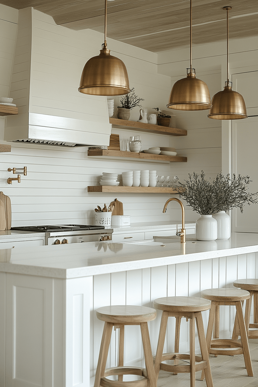 Open shelving creates a light and inviting feel that works beautifully in a beach house kitchen. Replacing upper cabinets with floating shelves instantly opens up the space and improves flow. When styled with simple dishware and subtle coastal accents, it feels both curated and relaxed. This approach allows natural light to move freely, making the kitchen feel brighter and more spacious. It’s a functional design that still feels modern and effortless. Give open shelving a try and transform the look of your kitchen.