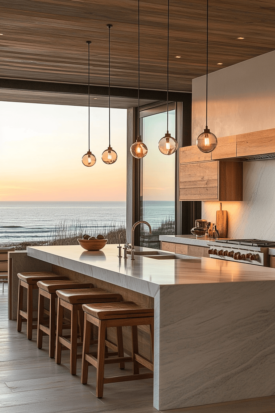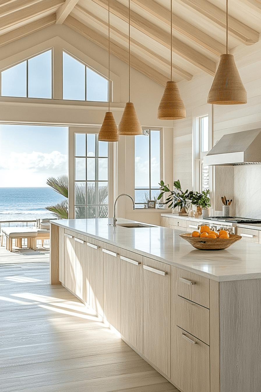 An open layout filled with natural light makes a beach house kitchen feel connected to its surroundings. Large windows and wide spaces help blur the line between indoors and outdoors. Light cabinetry and reflective surfaces enhance that bright, expansive feeling even more. This setup is perfect for gathering, cooking, and entertaining with ease. The overall atmosphere feels welcoming, relaxed, and effortlessly coastal. Design your kitchen around the view and enjoy a space that truly shines.
