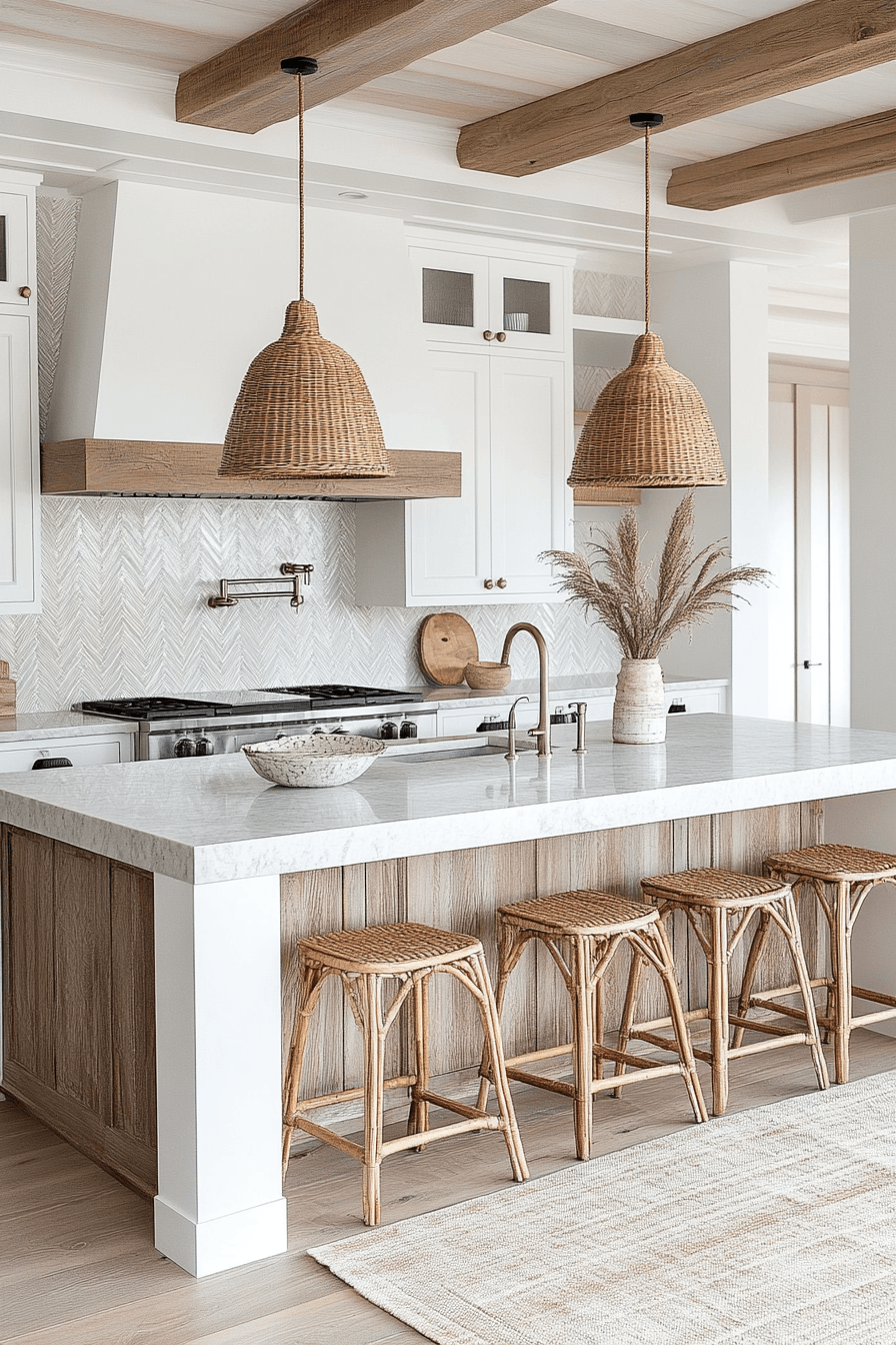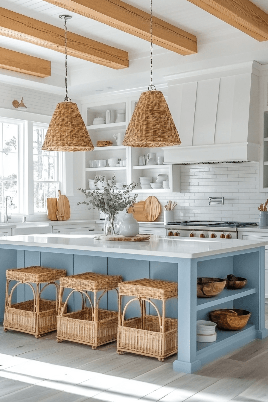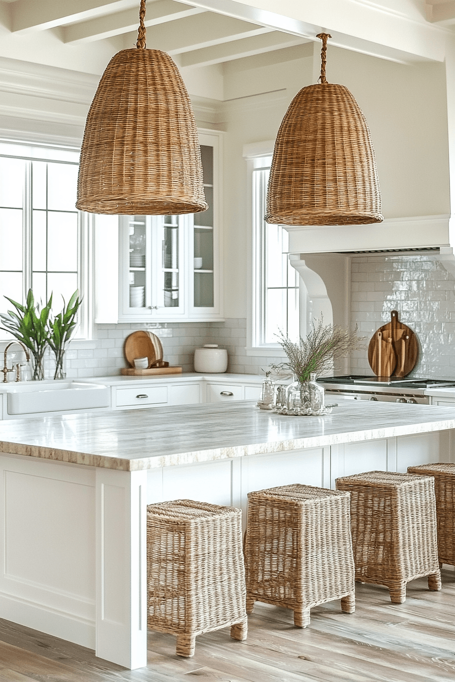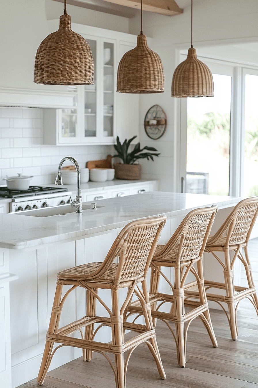 Layering natural materials adds depth and personality to a beach house kitchen while keeping it relaxed. Woven elements like rattan and wicker bring warmth without adding visual clutter. Against white cabinetry, these textures stand out in a subtle and balanced way. The organic feel helps connect the kitchen to its coastal surroundings. It creates a space that feels inviting, casual, and full of character. Add these textured details and give your kitchen a fresh coastal feel.