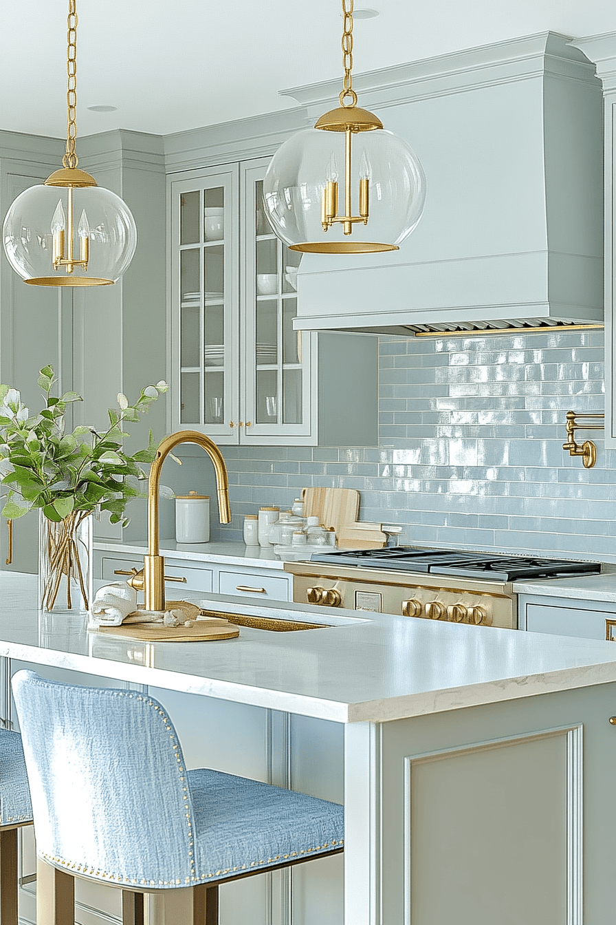Glass accents combined with warm metallic finishes bring a touch of elegance to a beach house kitchen. Glass-front cabinets keep the space feeling light and open while showcasing curated pieces. Brass hardware introduces warmth and a hint of shine without overpowering the design. The contrast feels sophisticated yet still easygoing. Soft coastal tones help tie everything together seamlessly. Add this polished look to your kitchen and elevate your coastal style.
