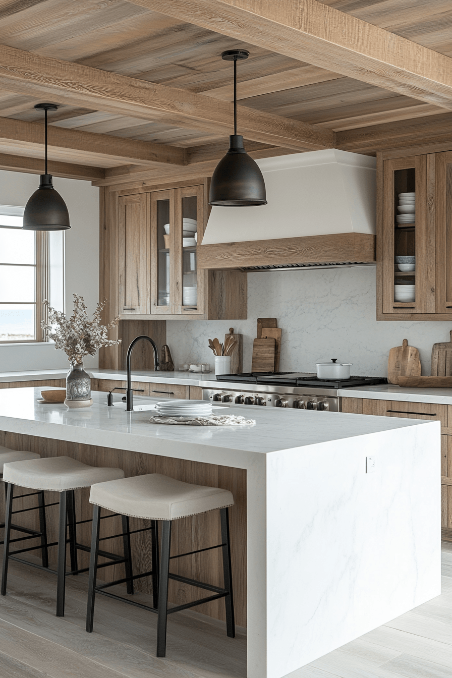 Blending weathered wood tones with sleek finishes gives a beach house kitchen a perfect mix of warmth and modern style. Soft gray-brown cabinetry adds depth while still keeping the coastal vibe intact. Pairing these tones with white countertops and simple hardware keeps everything looking clean and current. The natural texture adds character without making the space feel heavy or dark. It creates a relaxed, grounded look that still feels polished. Try this wood-inspired approach and elevate your kitchen with coastal charm.