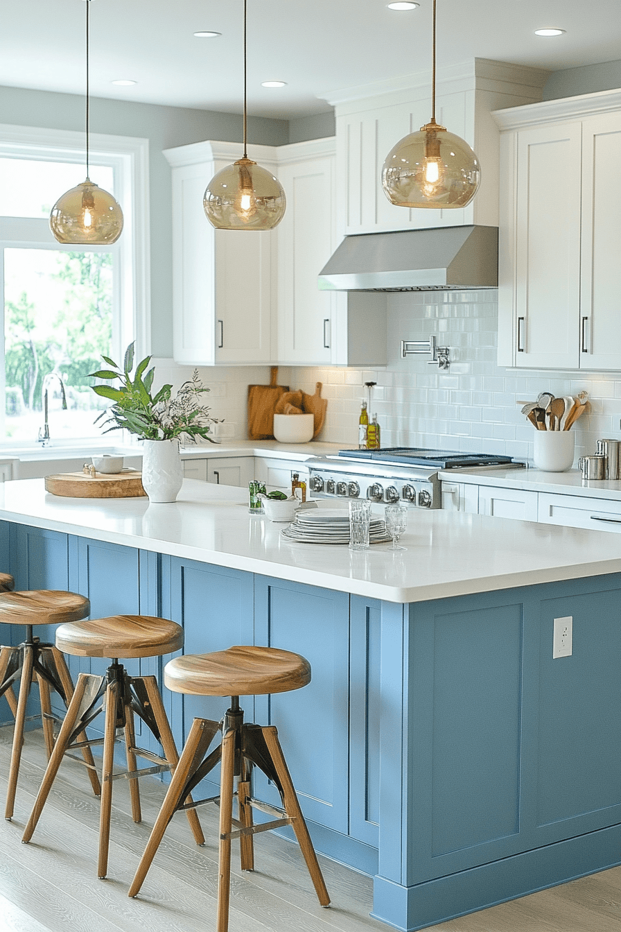 A soft blue peninsula introduces a gentle pop of color that enhances a beach house kitchen without overwhelming it. The muted blue tone pairs beautifully with white cabinetry, creating a fresh and balanced contrast. This feature helps define the kitchen area while still maintaining an open, welcoming layout. The color feels playful yet polished, adding just the right amount of personality. It’s an easy way to make the space feel unique and inviting. Add this coastal accent and bring new life into your kitchen.